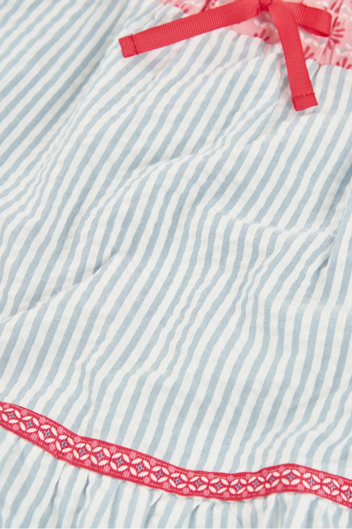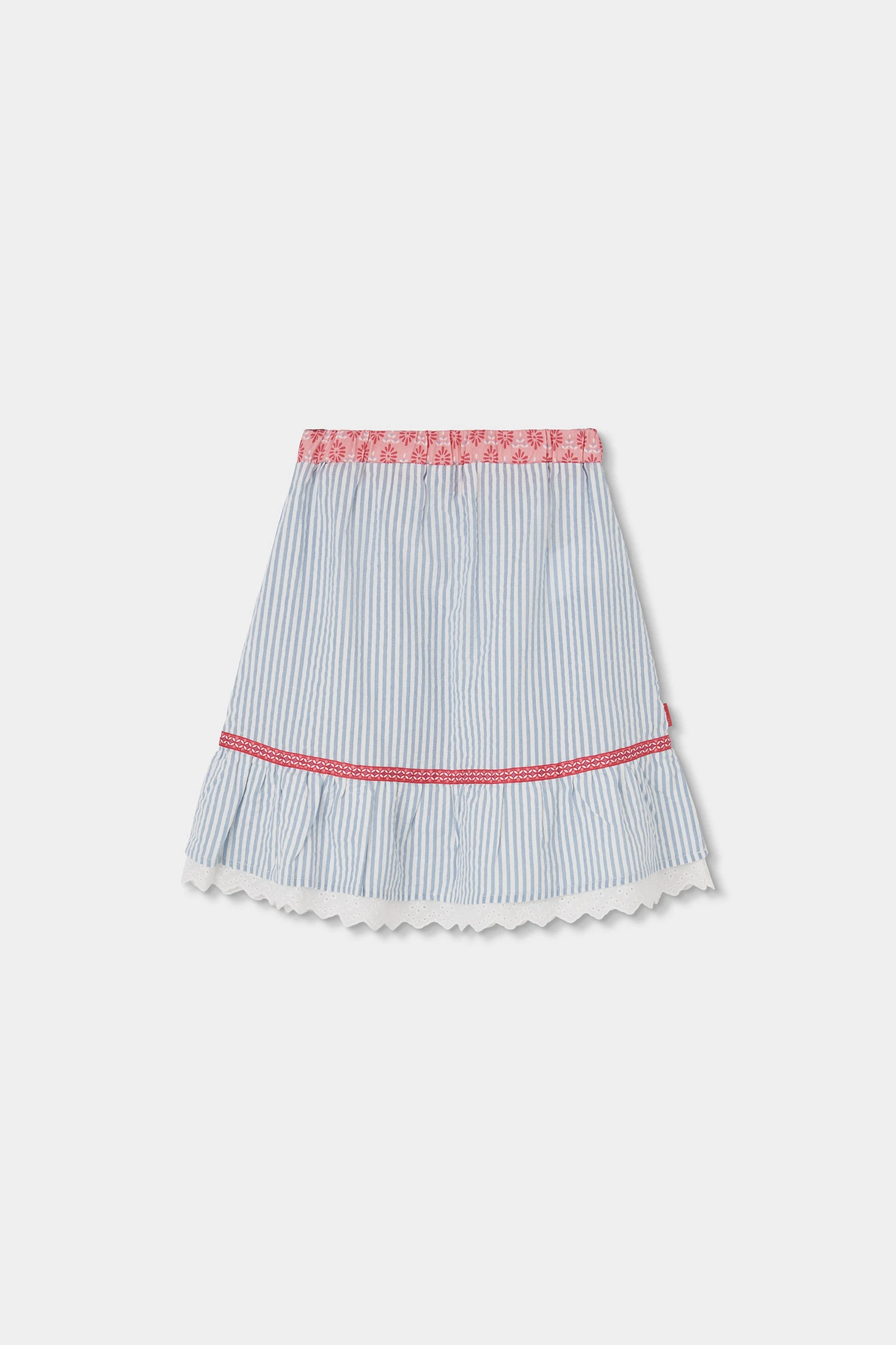 Popeline-Rock kombiniert, in blauen und weißen Streifen mit einem bedruckten rosa Bund, ideal für Mädchen von 12 Monaten bis 4 Jahren. Das Design zeigt einen rosa Blumenprint in der Taille und eine dekorative Schleife. Der Stoff mit blauen und weißen vertikalen Streifen bietet einen klassischen und frischen Stil. Er ist leicht, perfekt für den Sommer, und hat eine weiße Borte am unteren Rand, die einen zarten Akzent setzt. Lässt sich gut mit einfarbigen Blusen oder T-Shirts kombinieren und ist eine vielseitige und charmante Option für den Alltag.