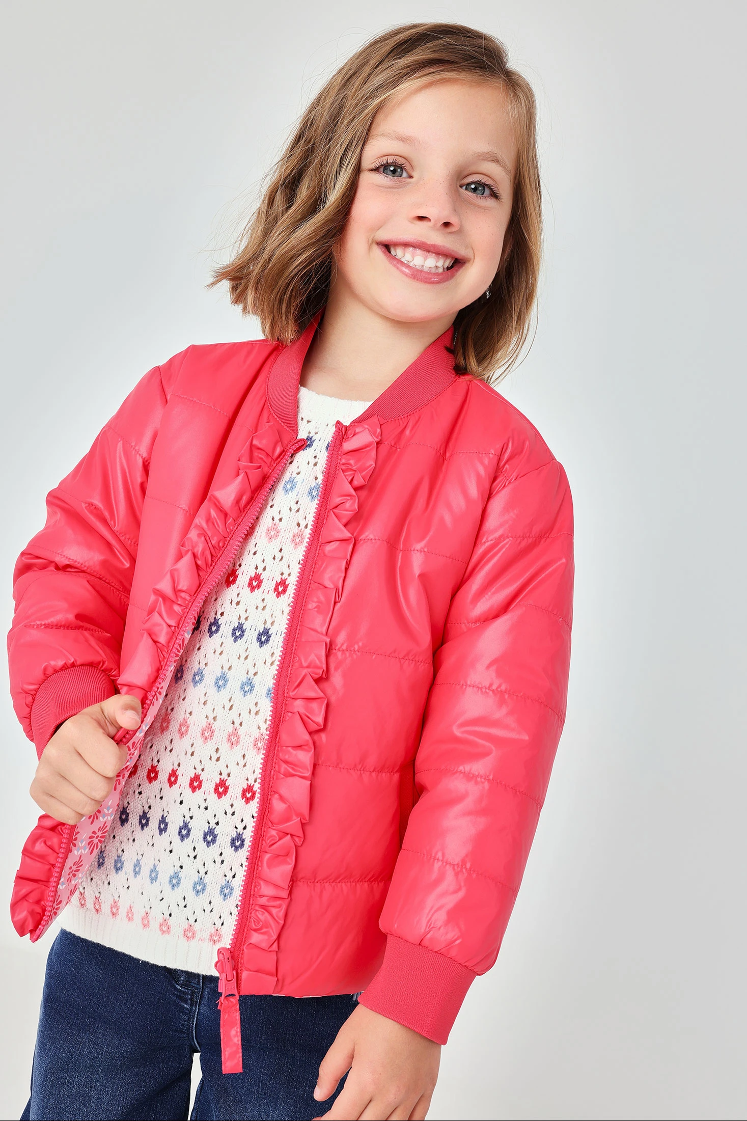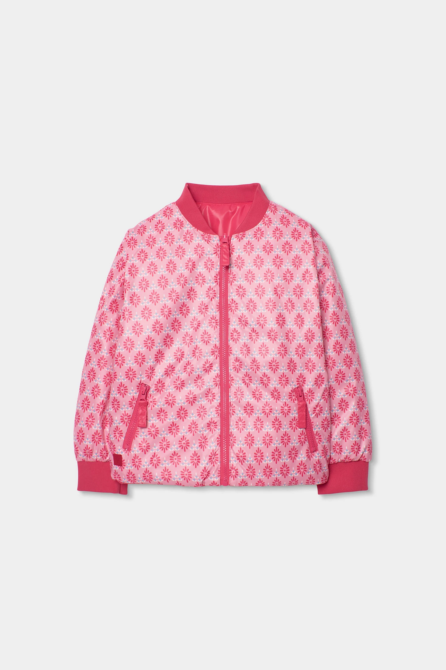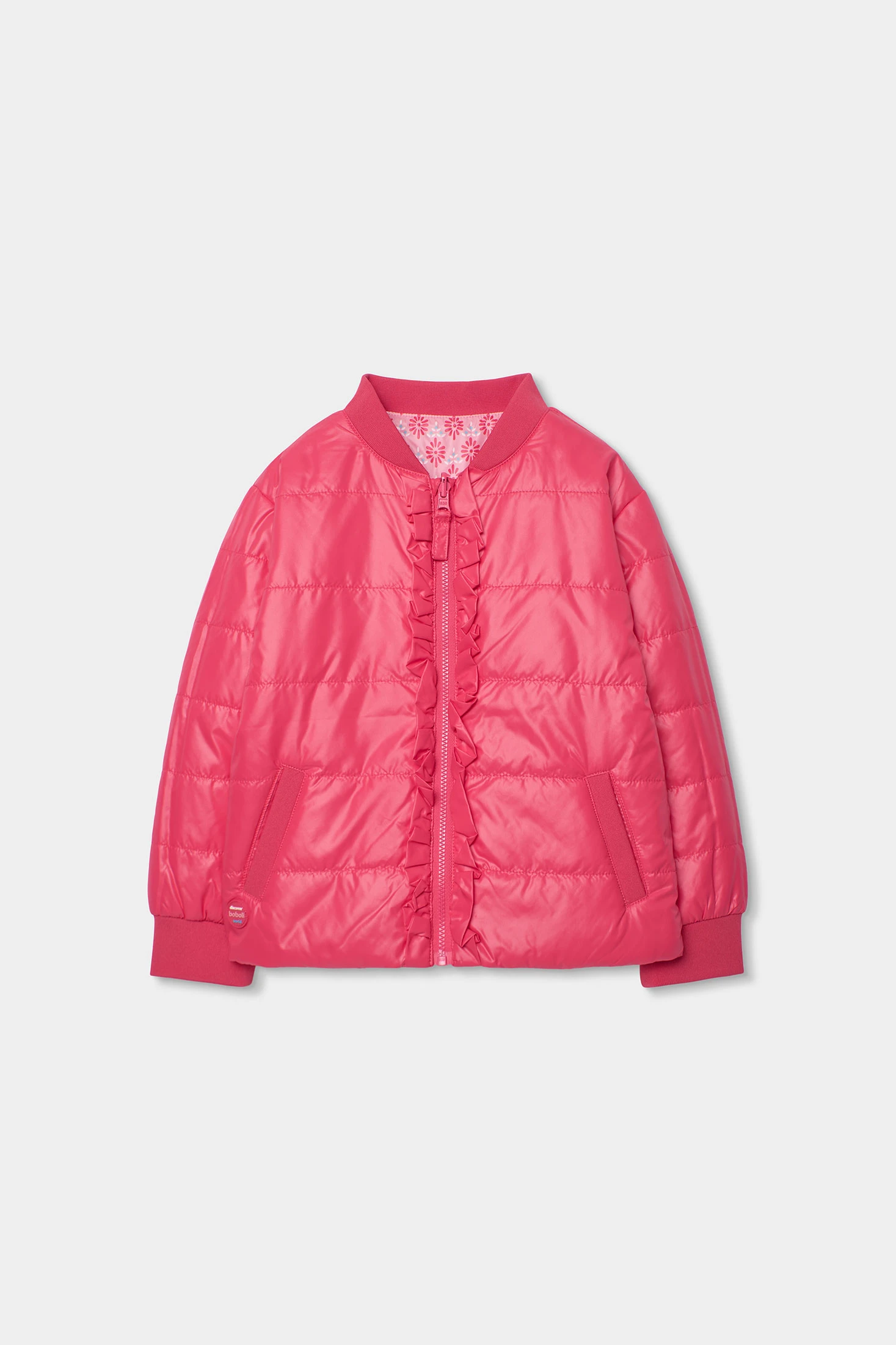 Wendbare Parka für Mädchen. Hergestellt aus technischem Stoff und wattiert, bietet Wärme und Komfort. Eine Seite zeigt ein schlichtes Design in kräftigem Rosa mit dekorativen Rüschen am Reißverschluss, während die andere Seite einen fröhlichen ethnischen Blumenprint in hellrosa und weißen Tönen präsentiert. Verfügbar in Größen von 12 Monaten bis 10 Jahren. Ihre Vielseitigkeit ermöglicht es, sie mit verschiedenen Stilen zu kombinieren und macht dieses Kleidungsstück zu einer praktischen und stilvollen Option für kalte Tage.