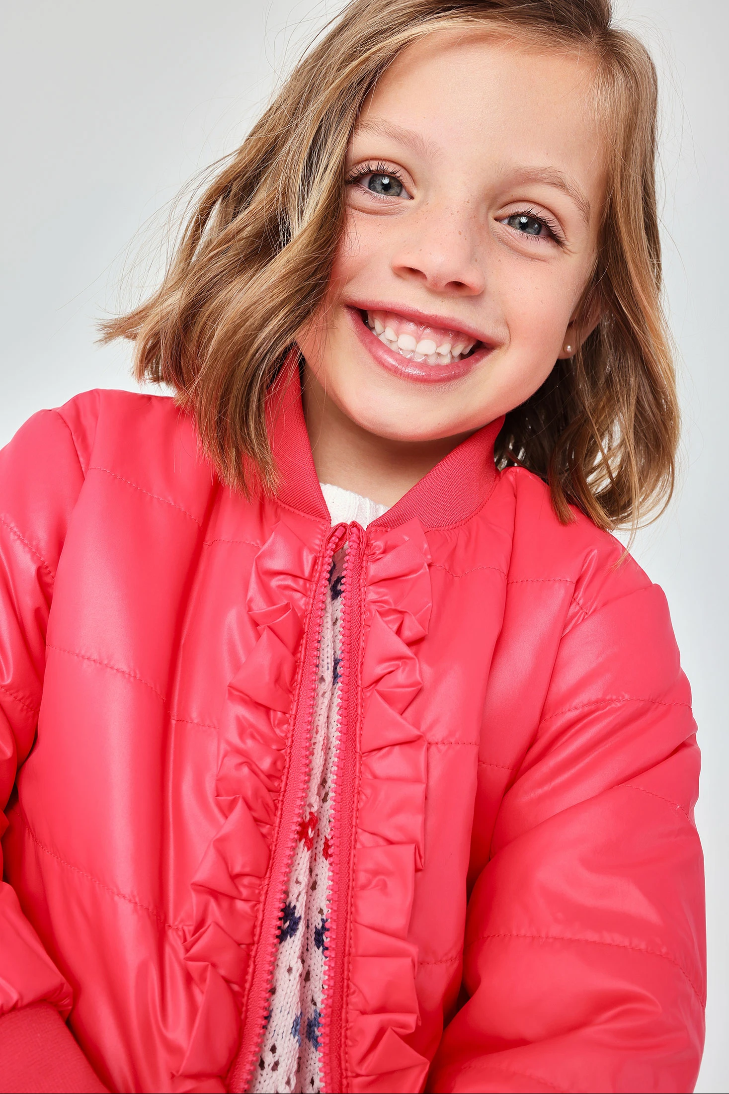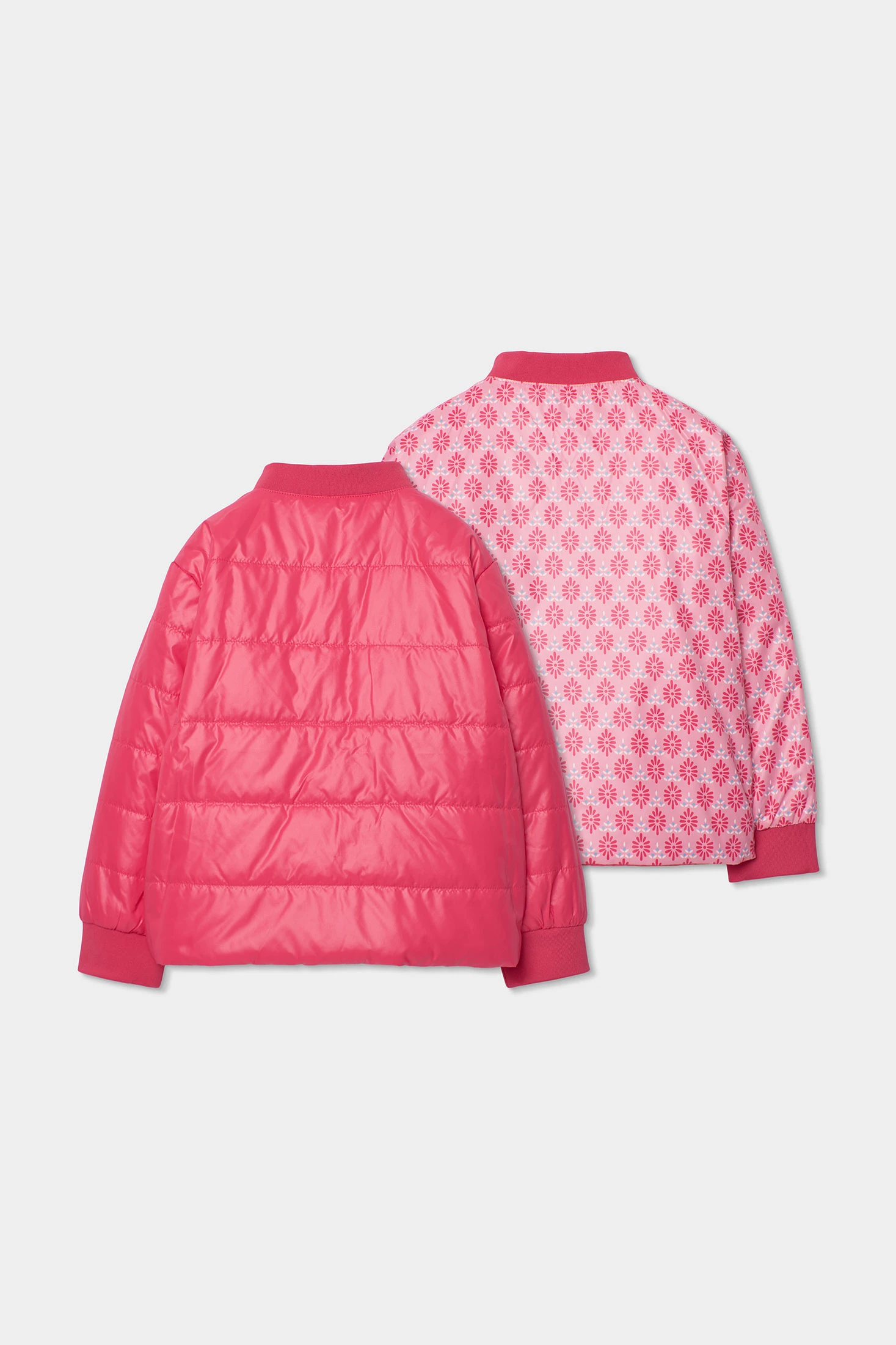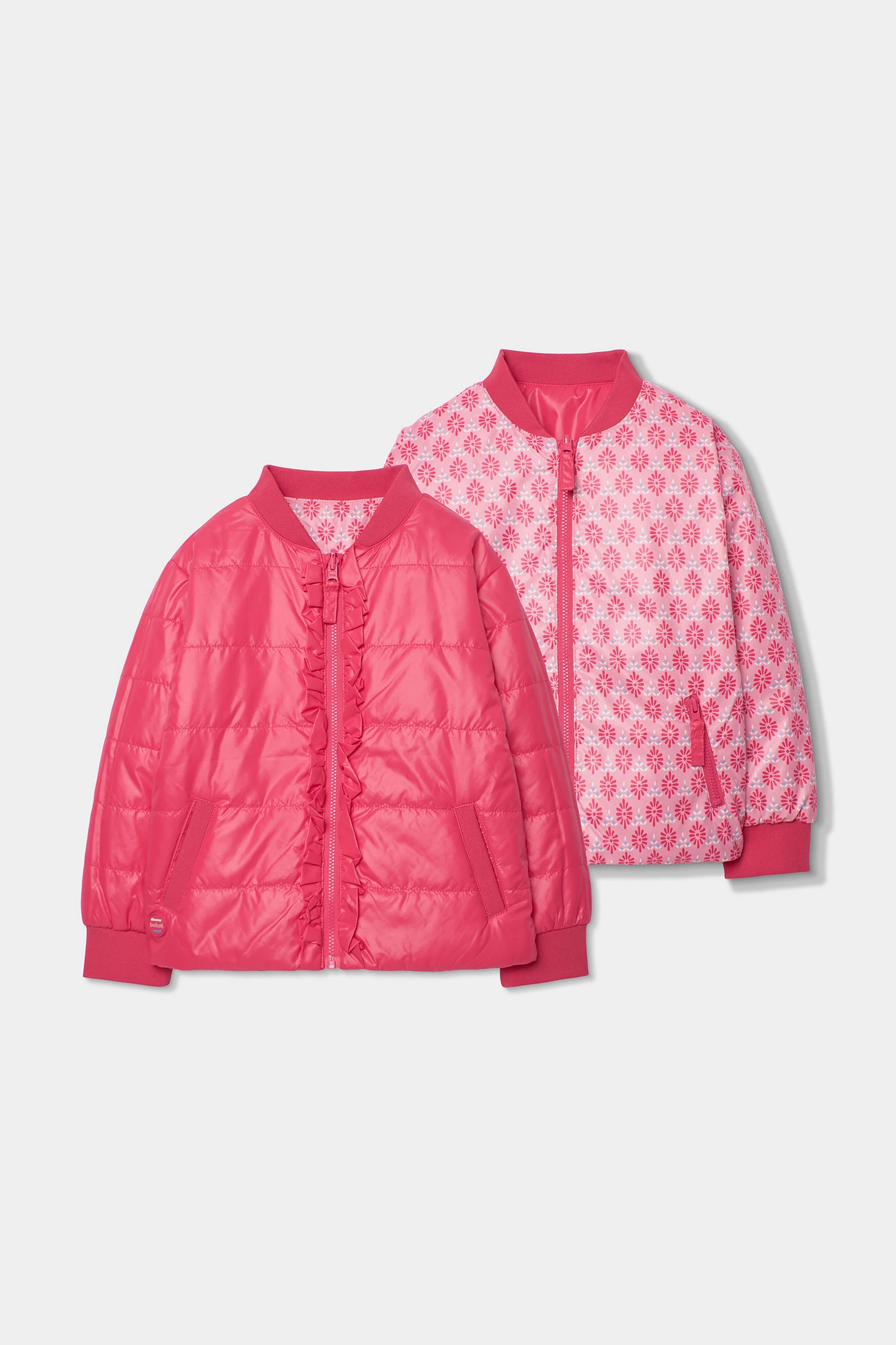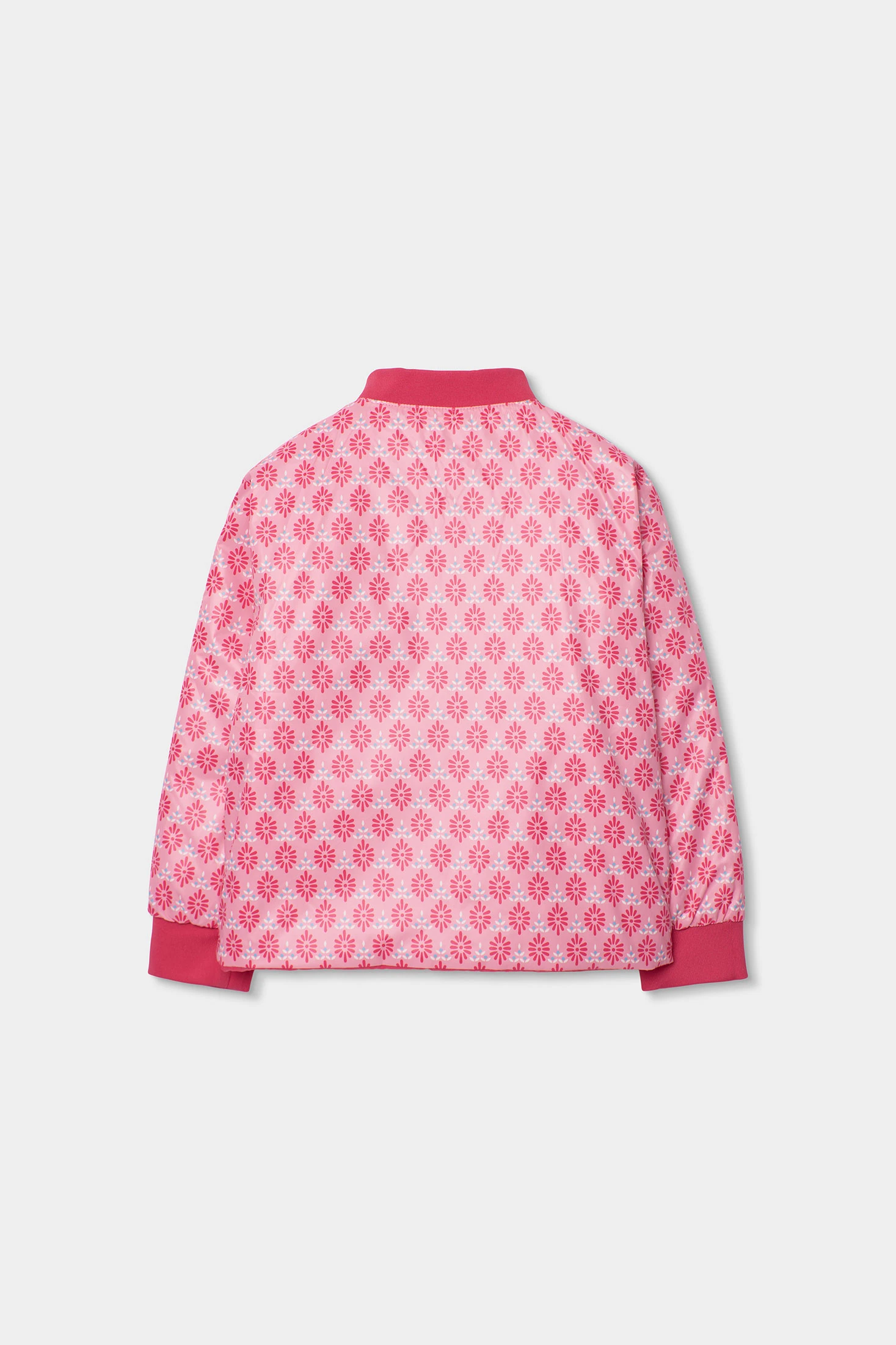 Wendbare Parka für Mädchen. Hergestellt aus technischem Stoff und wattiert, bietet Wärme und Komfort. Eine Seite zeigt ein schlichtes Design in kräftigem Rosa mit dekorativen Rüschen am Reißverschluss, während die andere Seite einen fröhlichen ethnischen Blumenprint in hellrosa und weißen Tönen präsentiert. Verfügbar in Größen von 12 Monaten bis 10 Jahren. Ihre Vielseitigkeit ermöglicht es, sie mit verschiedenen Stilen zu kombinieren und macht dieses Kleidungsstück zu einer praktischen und stilvollen Option für kalte Tage.