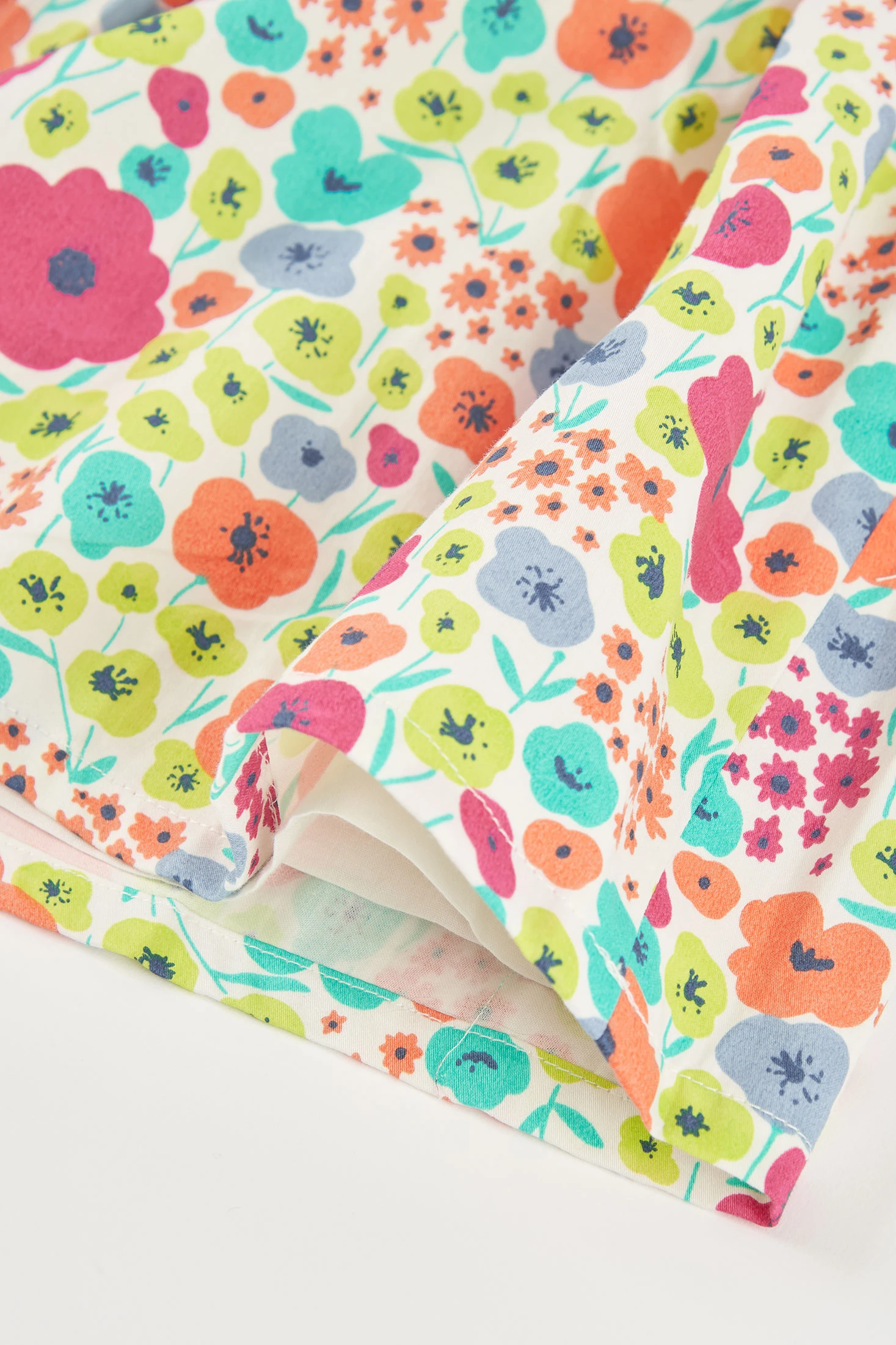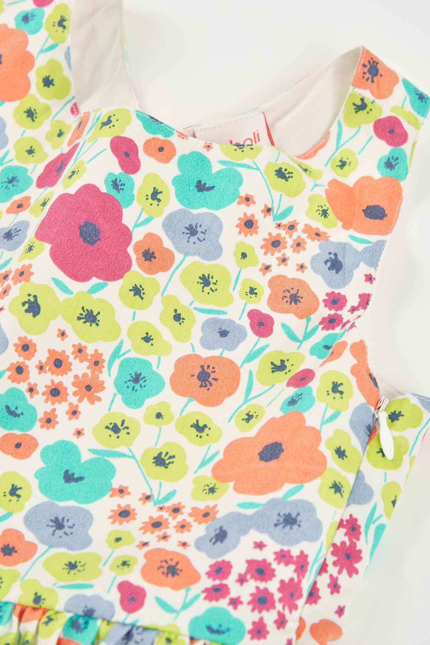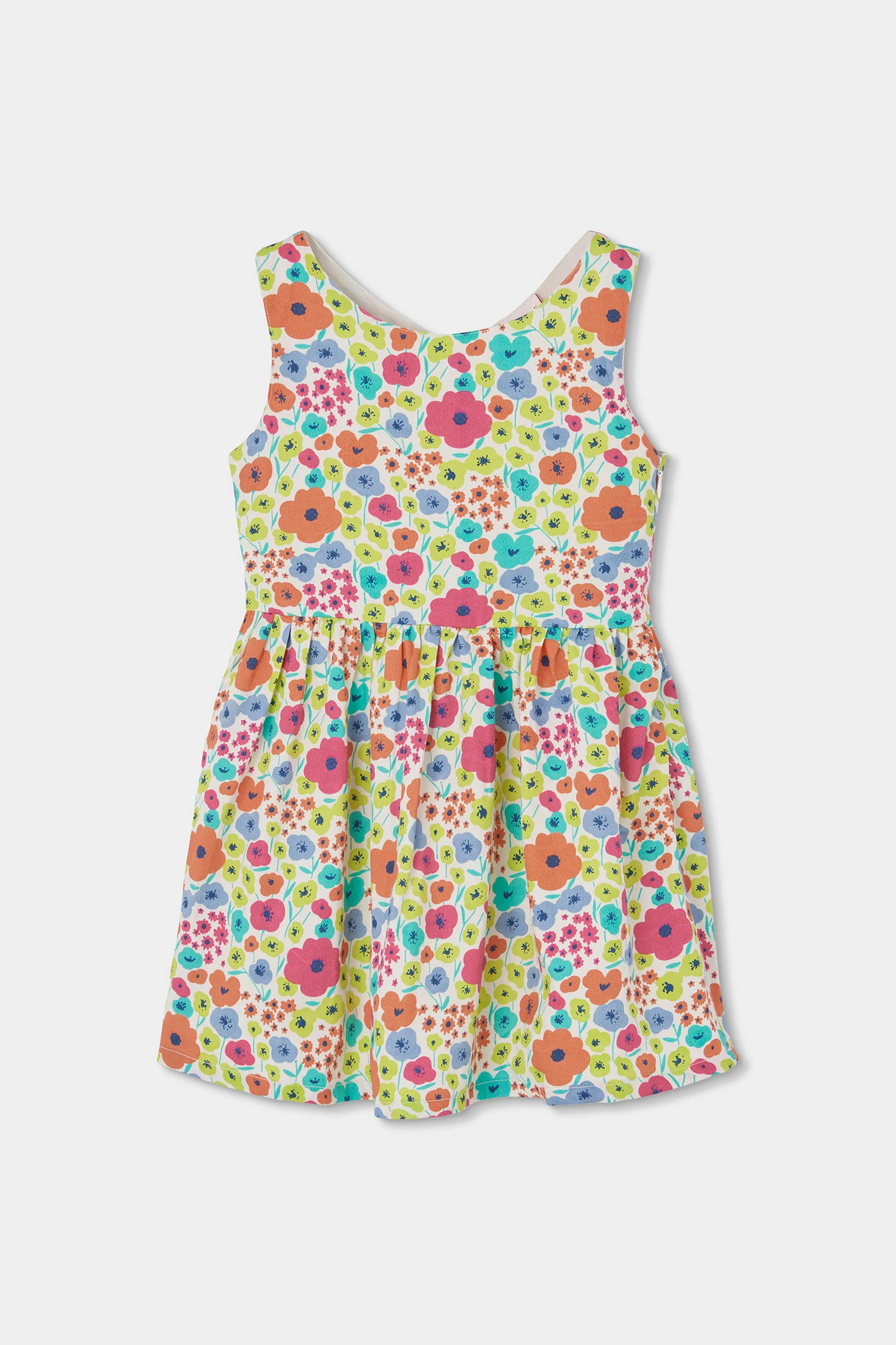 Bedrucktes Satin-Kleid mit Blumenmuster für Mädchen, ideal, um jedem Frühlings- oder Sommerereignis einen Farbtupfer hinzuzufügen. Hergestellt aus weichem Satin, bietet es Komfort und Leichtigkeit. Das ärmellose Design und der ausgestellte Schnitt ermöglichen Bewegungsfreiheit. Es zeigt ein florales Muster in lebhaften Farben auf einem perlweißen Hintergrund. Erhältlich in Größen von 12 Monaten bis 10 Jahren, kann es in verschiedenen Wachstumsphasen getragen werden. Perfekt kombinierbar mit einfachen Accessoires, die das fröhliche und auffällige Muster betonen.