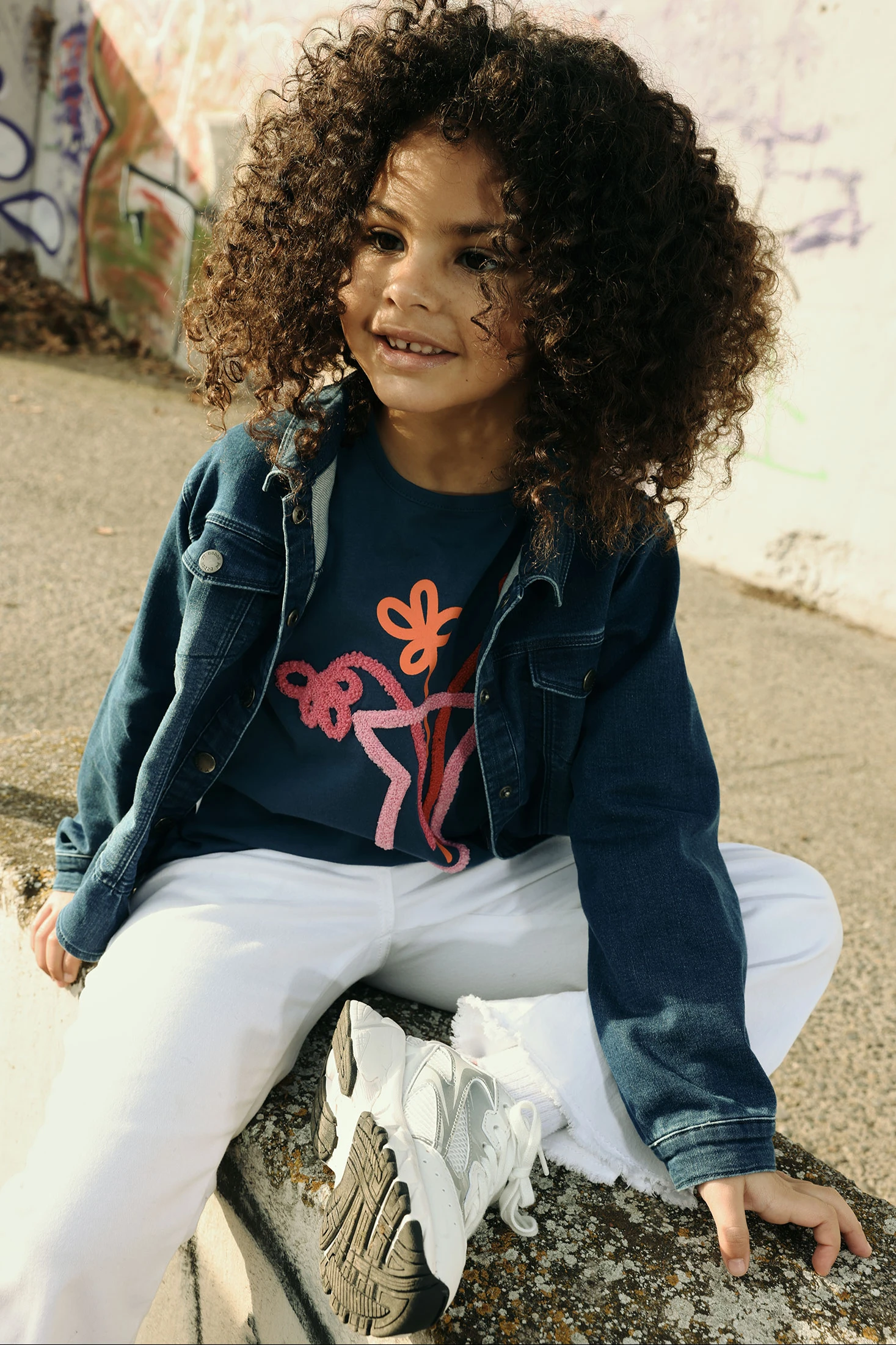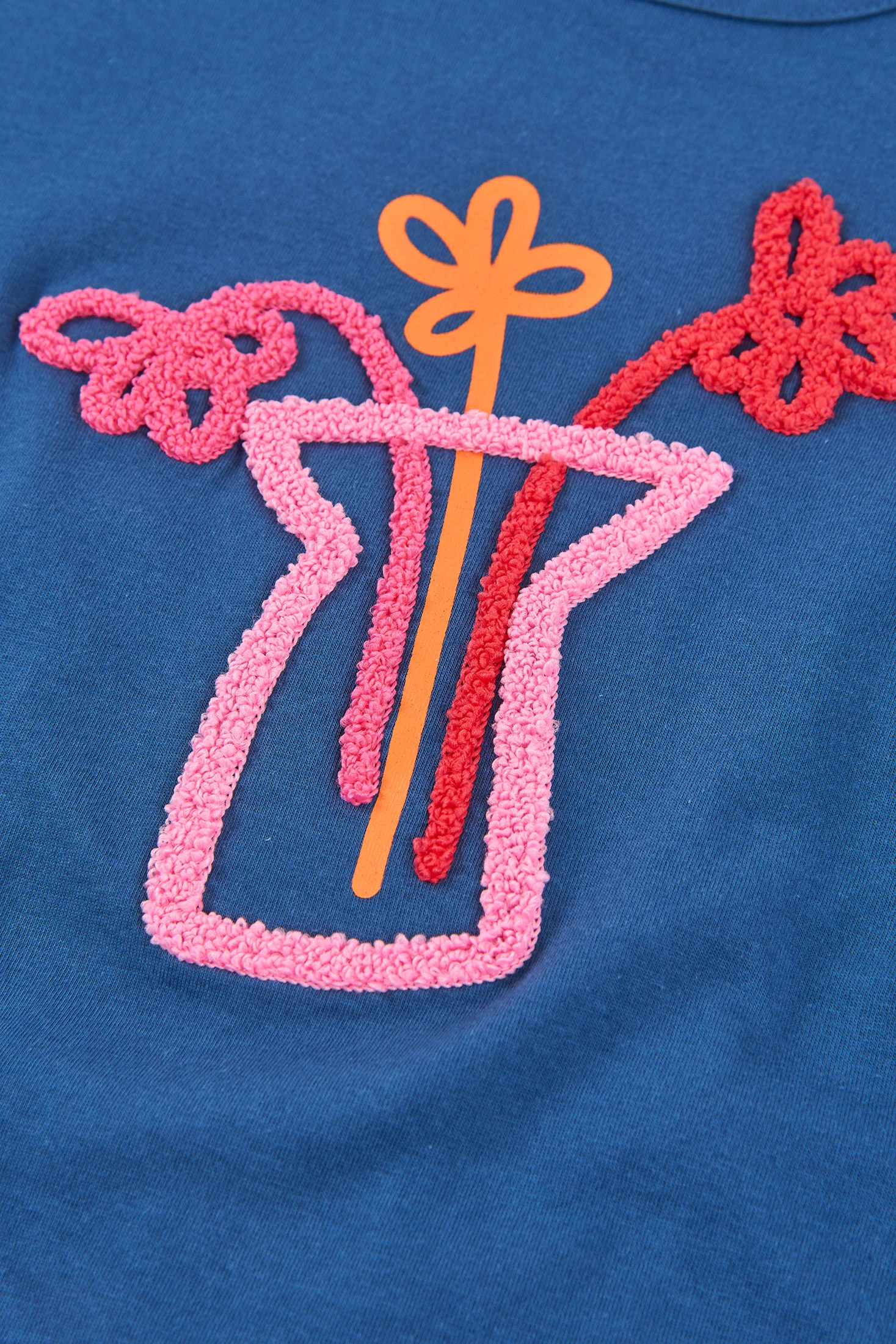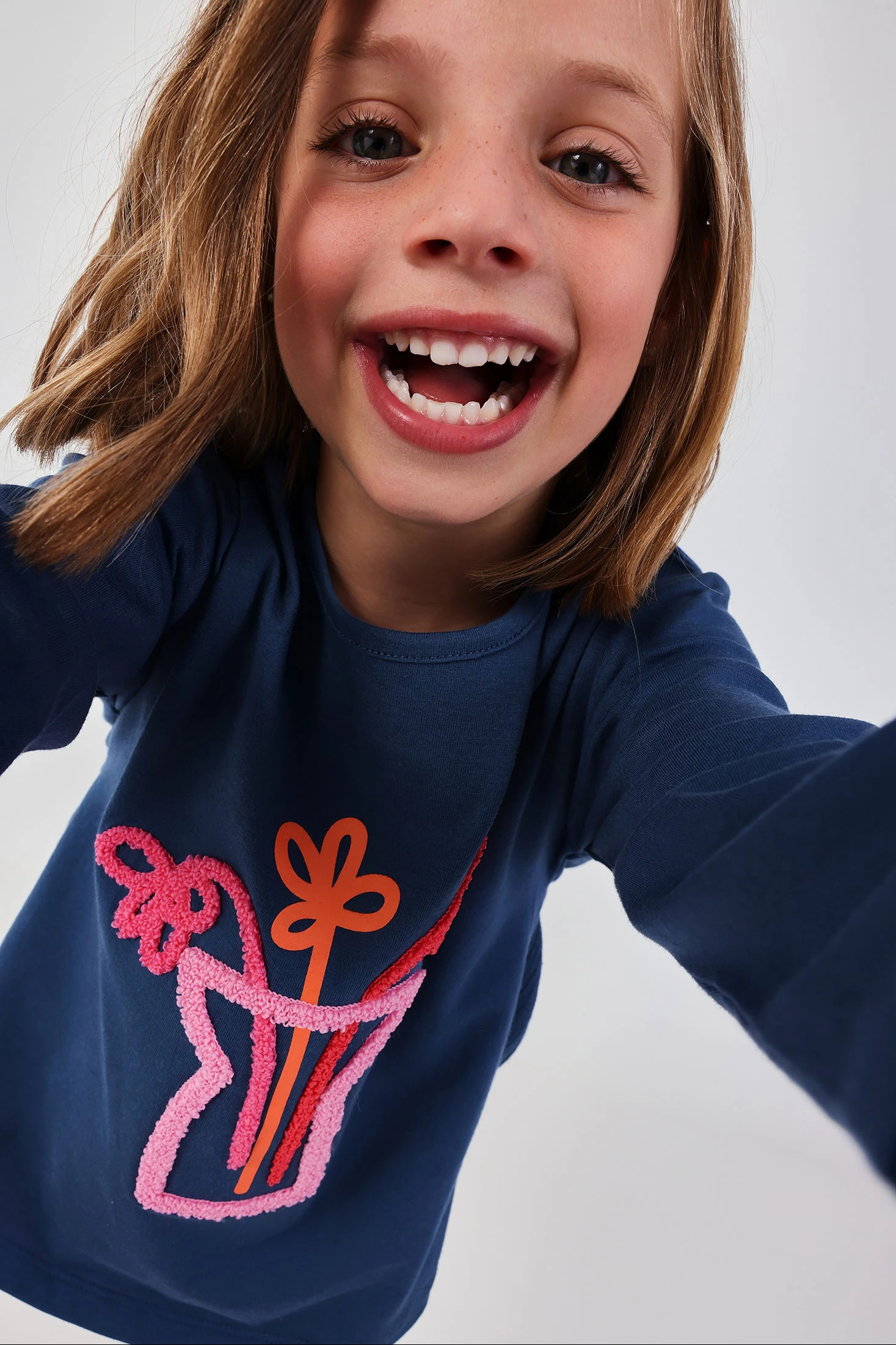 Marineblaues Strick-T-Shirt für Mädchen, ideal für Herbst und Winter. Hergestellt aus Baumwolle, bietet es Komfort und Weichheit. Das Design umfasst einen bunten Druck mit Vase und Blumen, der einen lustigen und kreativen Akzent setzt. Es hat einen Rundhalsausschnitt und lange Ärmel, perfekt für kühlere Tage. Verfügbar in Größen von 12 Monaten bis 14 Jahren, ist es ein vielseitiges Kleidungsstück, das sich leicht mit Jeans oder Röcken kombinieren lässt und Stil und Komfort in die tägliche Garderobe bringt.