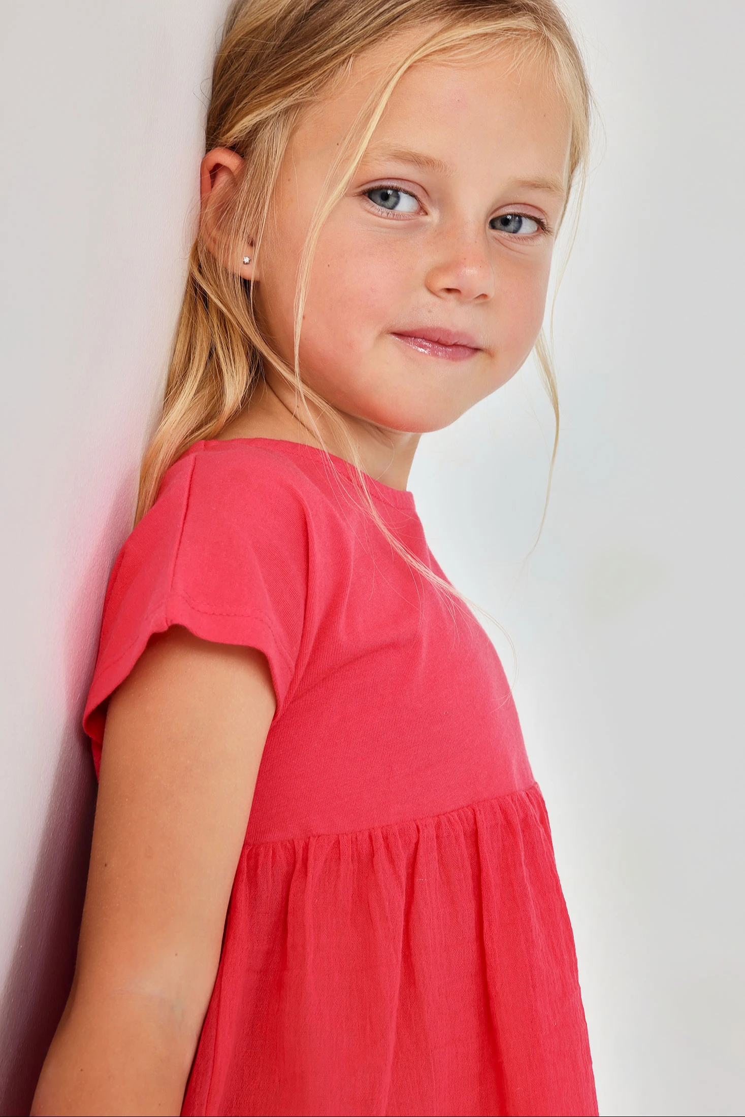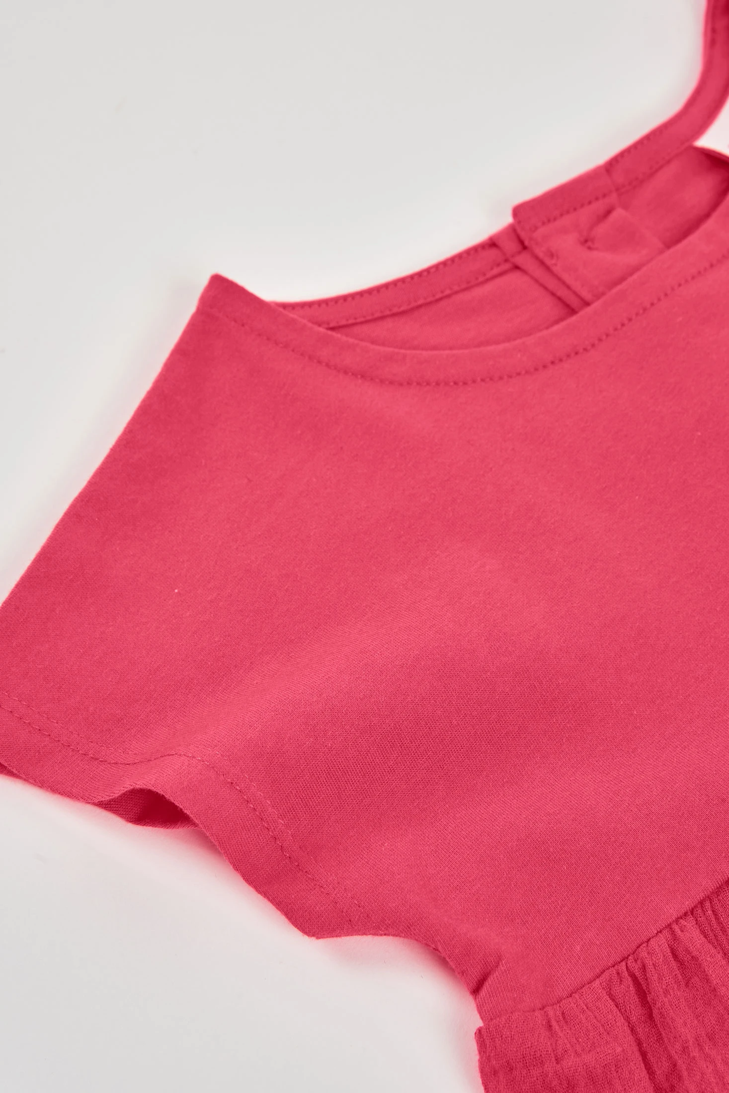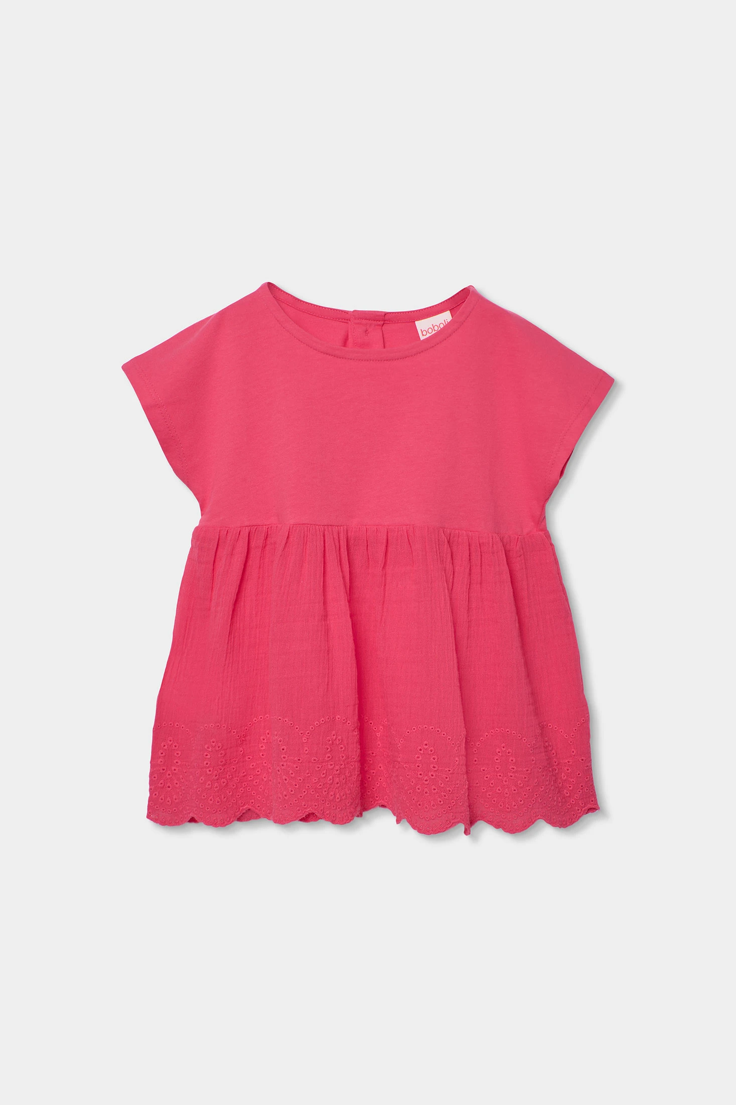 Baumwoll-Strick-T-Shirt für Mädchen, ideal für die Kleinsten. Erhältlich in Größen von 12 Monaten bis 14 Jahren, passt es sich verschiedenen Wachstumsphasen an. Seine leuchtende Erdbeerfarbe verleiht einen fröhlichen und femininen Touch. Das Design zeigt ein eng anliegendes Oberteil und einen unteren Rock mit Lochmuster, die einen eleganten und bequemen Stil bieten. Perfekt zum Kombinieren mit Jeans oder Röcken. Die kurzen Ärmel und der Rundhalsausschnitt machen es für jeden Tag der Saison geeignet und verleihen Frische und Stil.