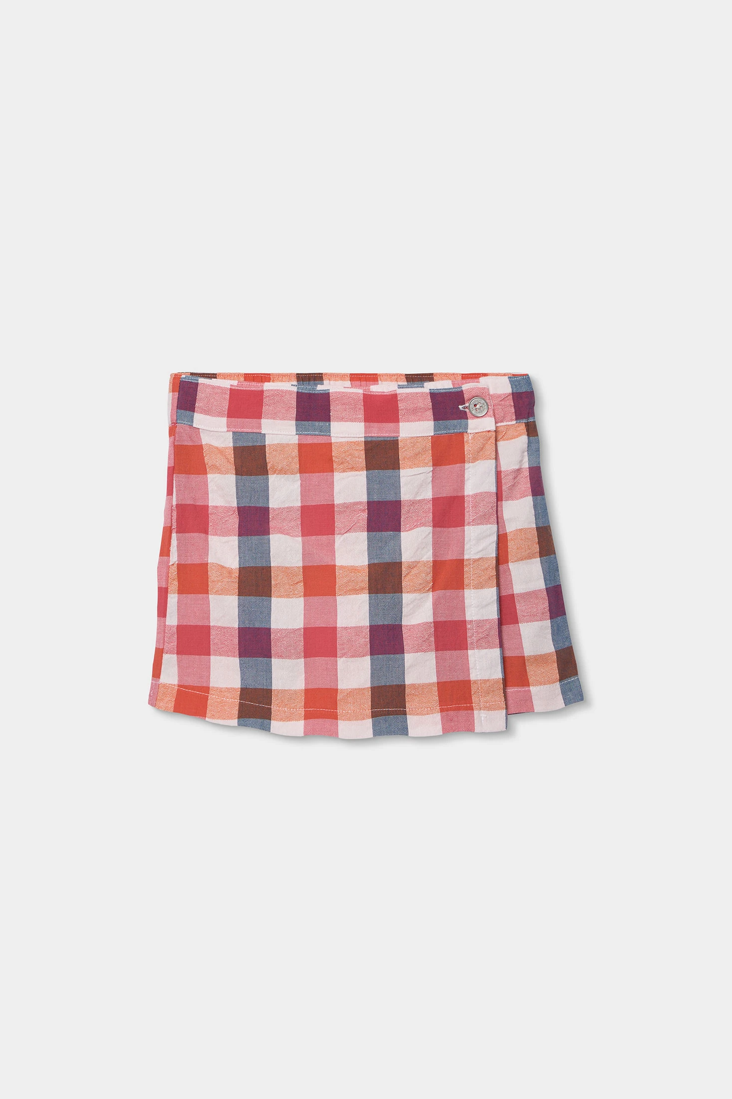 Karierter Rock, ideal für die Frühlings- und Sommersaison. Hergestellt aus einem leichten Stoff, bietet er Komfort und Stil. Er zeigt ein Karomuster in Rot-, Rosa-, Braun- und Blautönen und einen Knopfverschluss an der Taille. Verfügbar in den Größen 2 bis 12 Jahre, ist er ein vielseitiges Kleidungsstück, das mit einfarbigen T-Shirts oder bunten Accessoires kombiniert werden kann, um einen fröhlichen und lässigen Look zu kreieren.