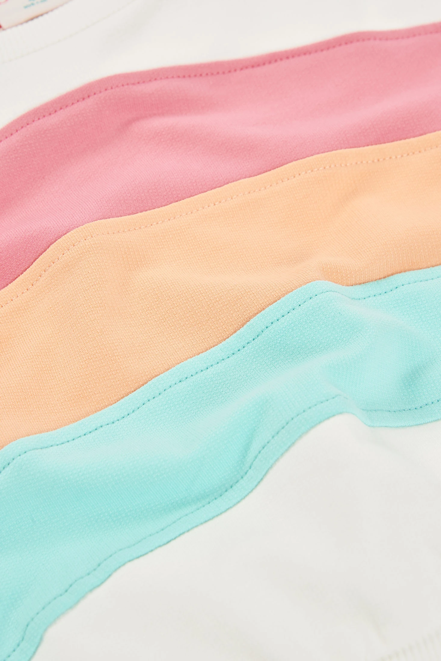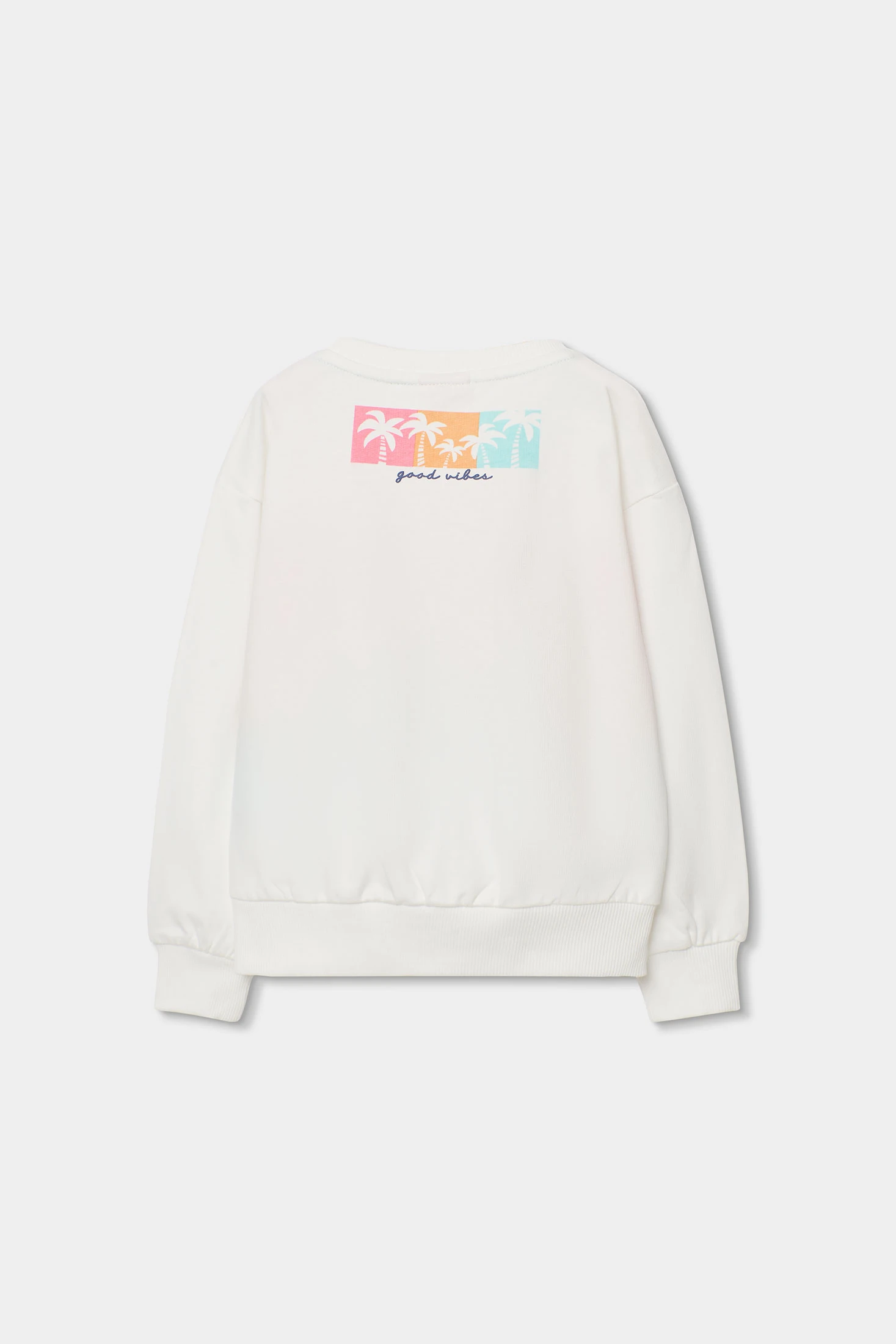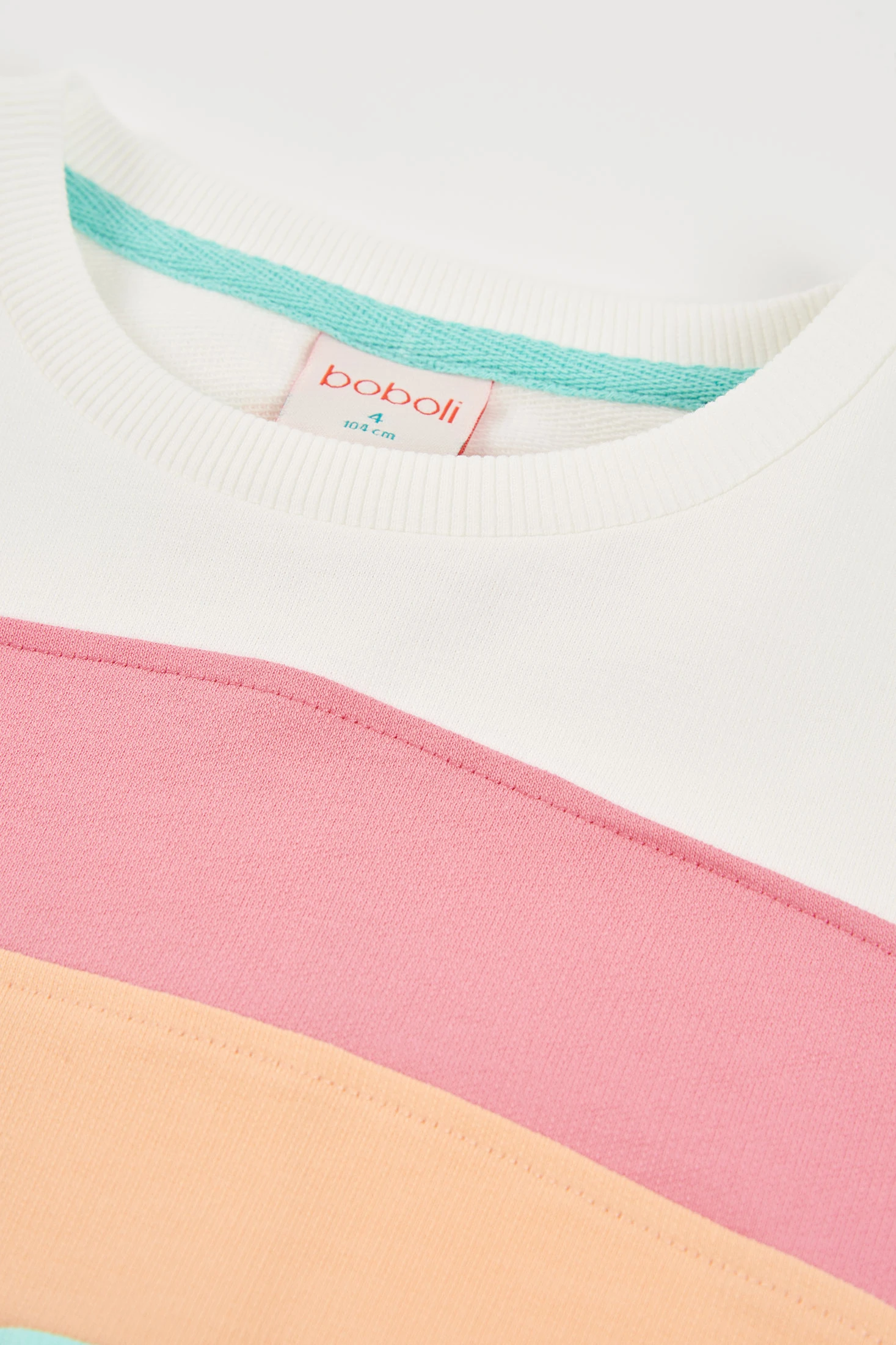 Weiße Fleecesweatshirt für Mädchen, perfekt für die Übergangszeit. Gefertigt aus einem weichen und bequemen Stoff, präsentiert es ein fröhliches Design mit rosa, orange und blauen Streifen auf der Brust. Die langen Ärmel und der Rundhalsausschnitt bieten Wärme für kühlere Tage. Erhältlich in Größen von 12 Monaten bis 140 Jahren, ist es ideal, um mit Jeans oder Leggings zu kombinieren. Sein vielseitiger Stil macht es zu einem unverzichtbaren Kleidungsstück in jedem Mädchenkleiderschrank und verleiht ihrem Alltag einen Hauch von Farbe und Spaß.