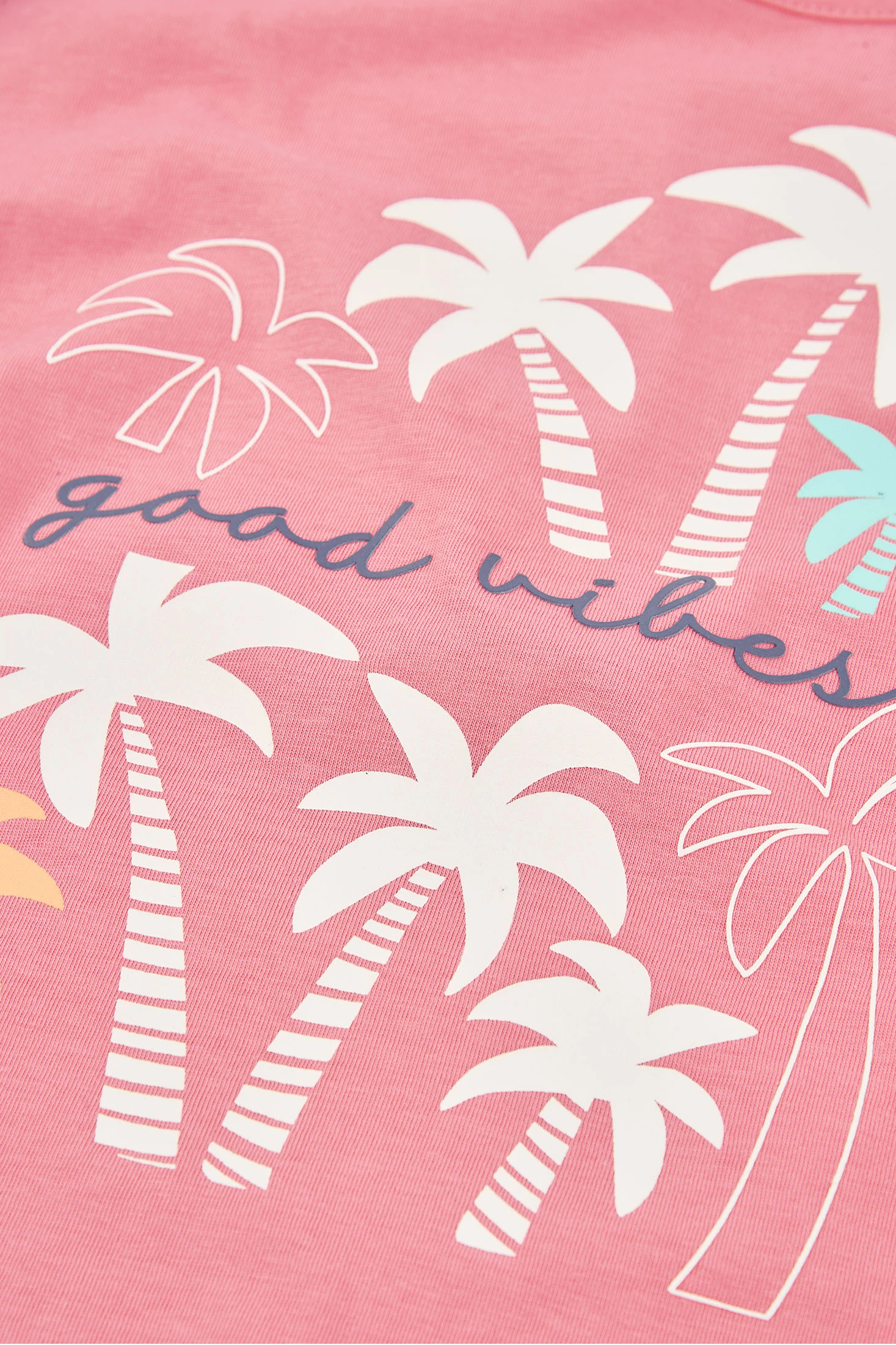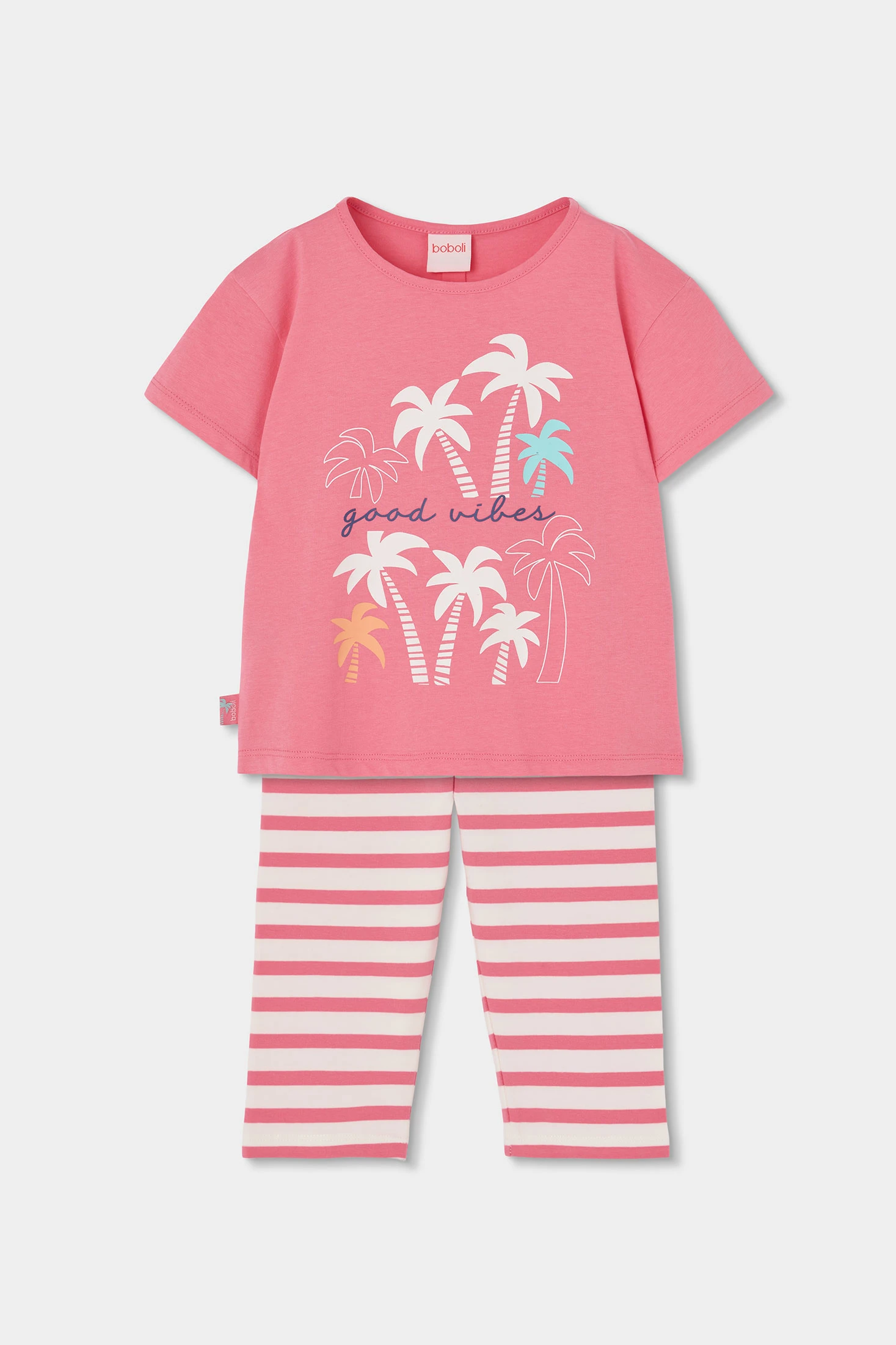 Baumwoll-Strickset für Mädchen, ideal für den Sommer. Es beinhaltet ein rosa T-Shirt mit Palmenprints in verschiedenen Farben und dem Schriftzug "good vibes", kombiniert mit gestreiften rosa-weißen Leggings. Perfekte Weichheit und Komfort für Spiel- und Entspannungstage. Erhältlich in Größen von 12 Monaten bis 12 Jahren. Fröhliches und farbenfrohes Design, das einen frischen und jugendlichen Stil verleiht und dieses Set zu einer vielseitigen und charmanten Wahl für die Saison macht.