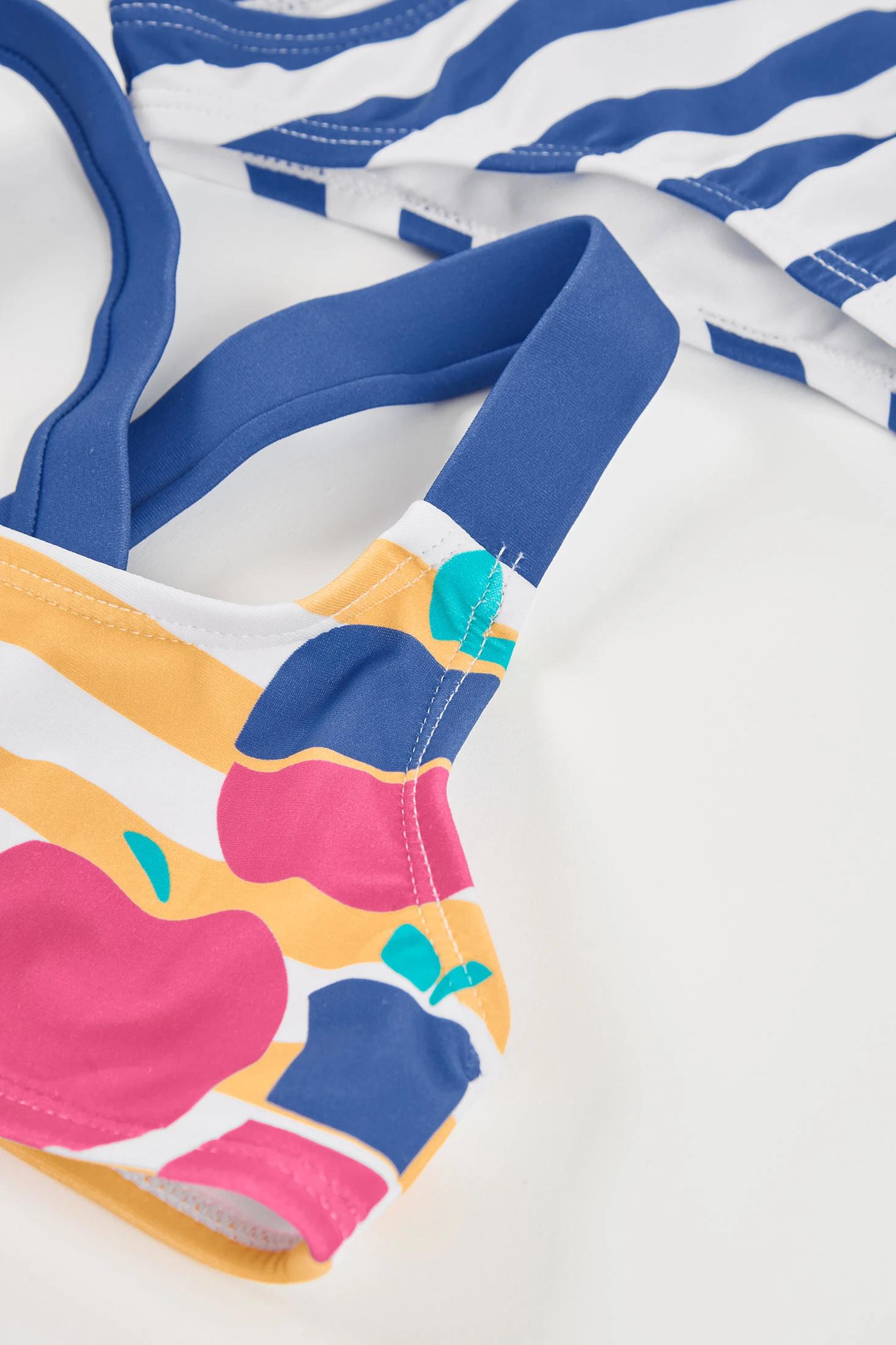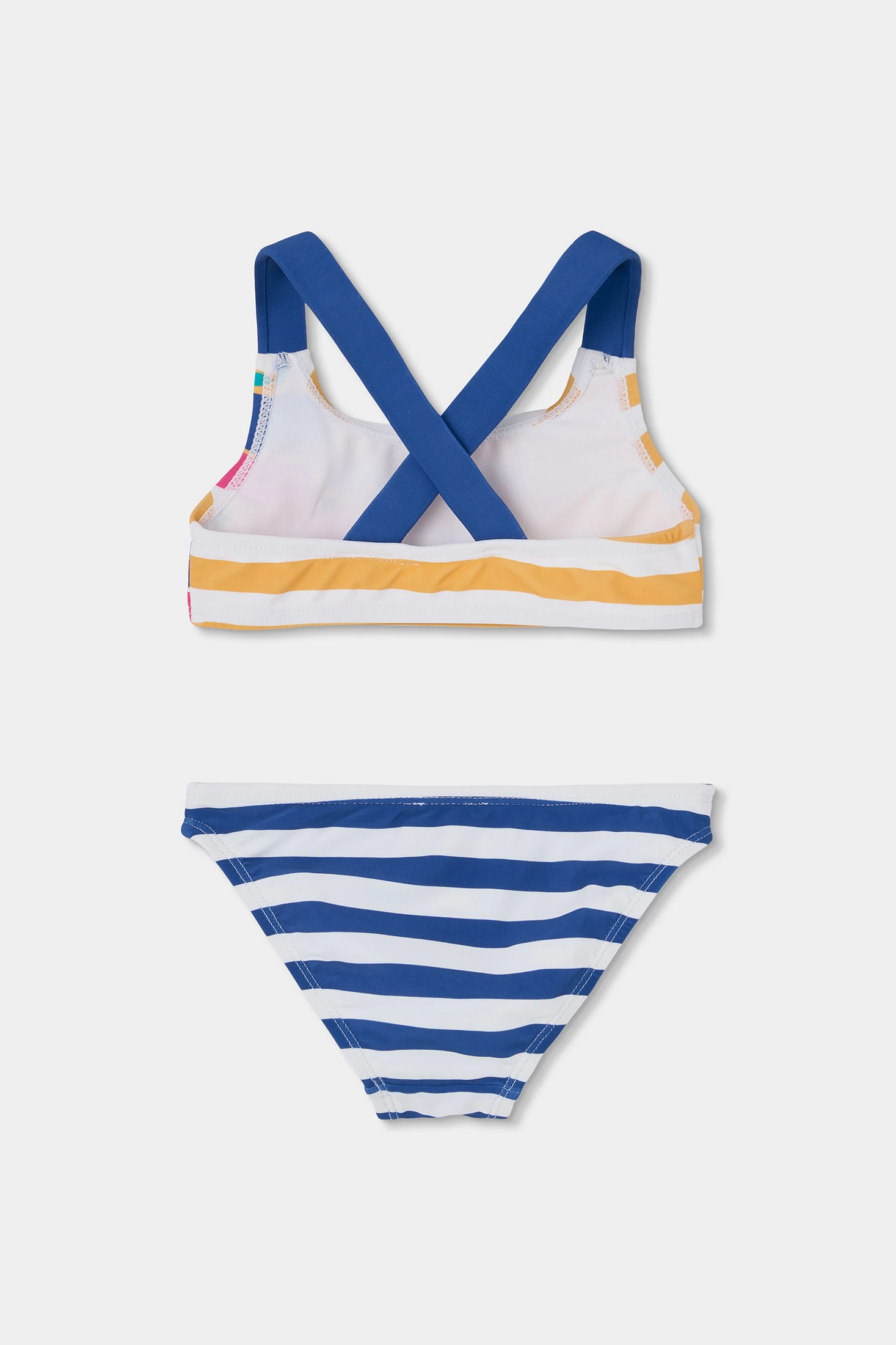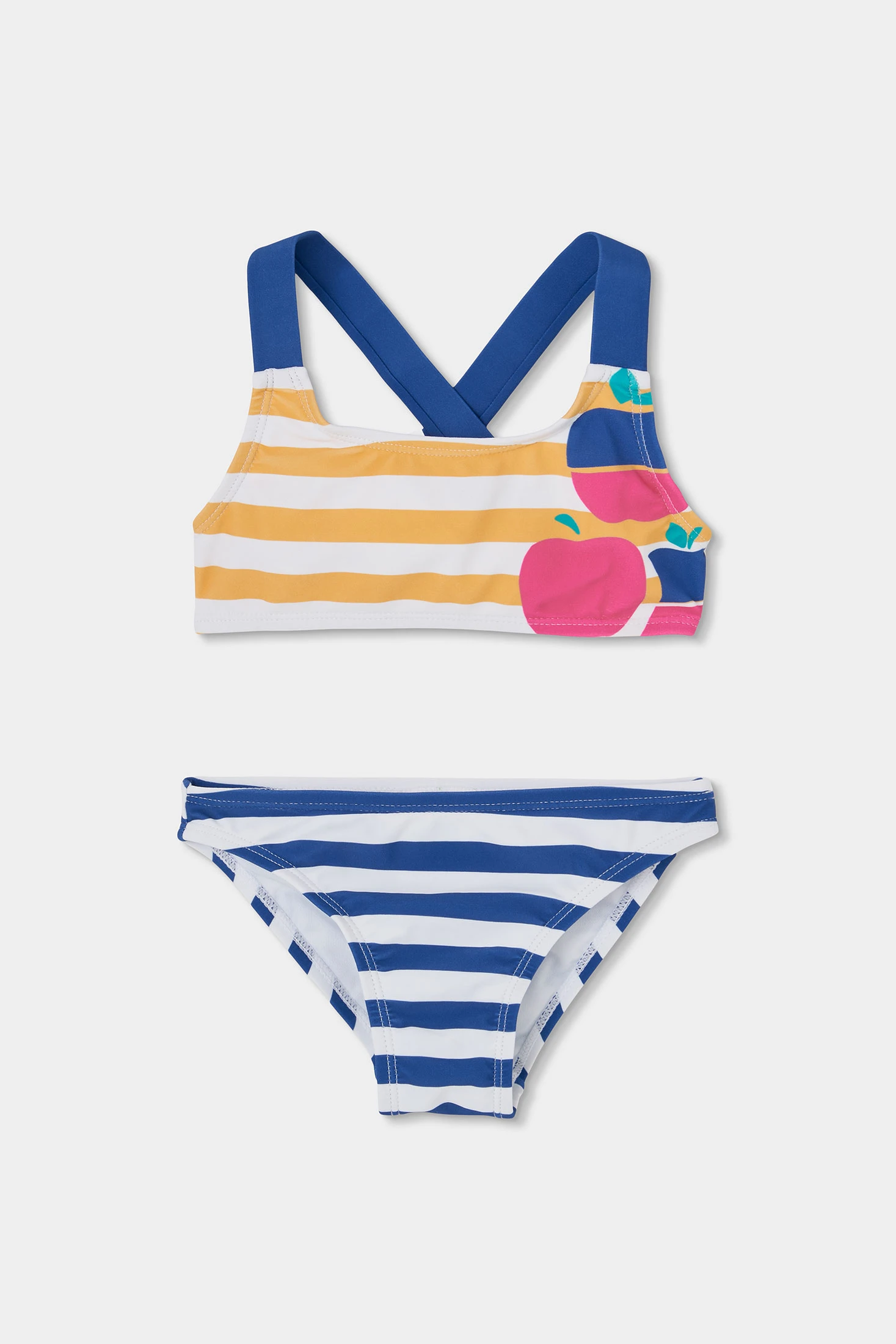 Mädchen-Bikini mit zertifiziertem UPF50+-Sonnenschutz, mit einem blau-gelben Streifendesign, das einen sommerlichen und lustigen Touch verleiht. Er enthält Fruchtdetails, die dem Set ein verspieltes Element hinzufügen, und blaue Träger, die sich am Rücken kreuzen, für einen sicheren Sitz. Aus wasserbeständigem Material gefertigt, das Komfort und Bewegungsfreiheit garantiert. Erhältlich in Größen von 12M bis 14 Jahren.