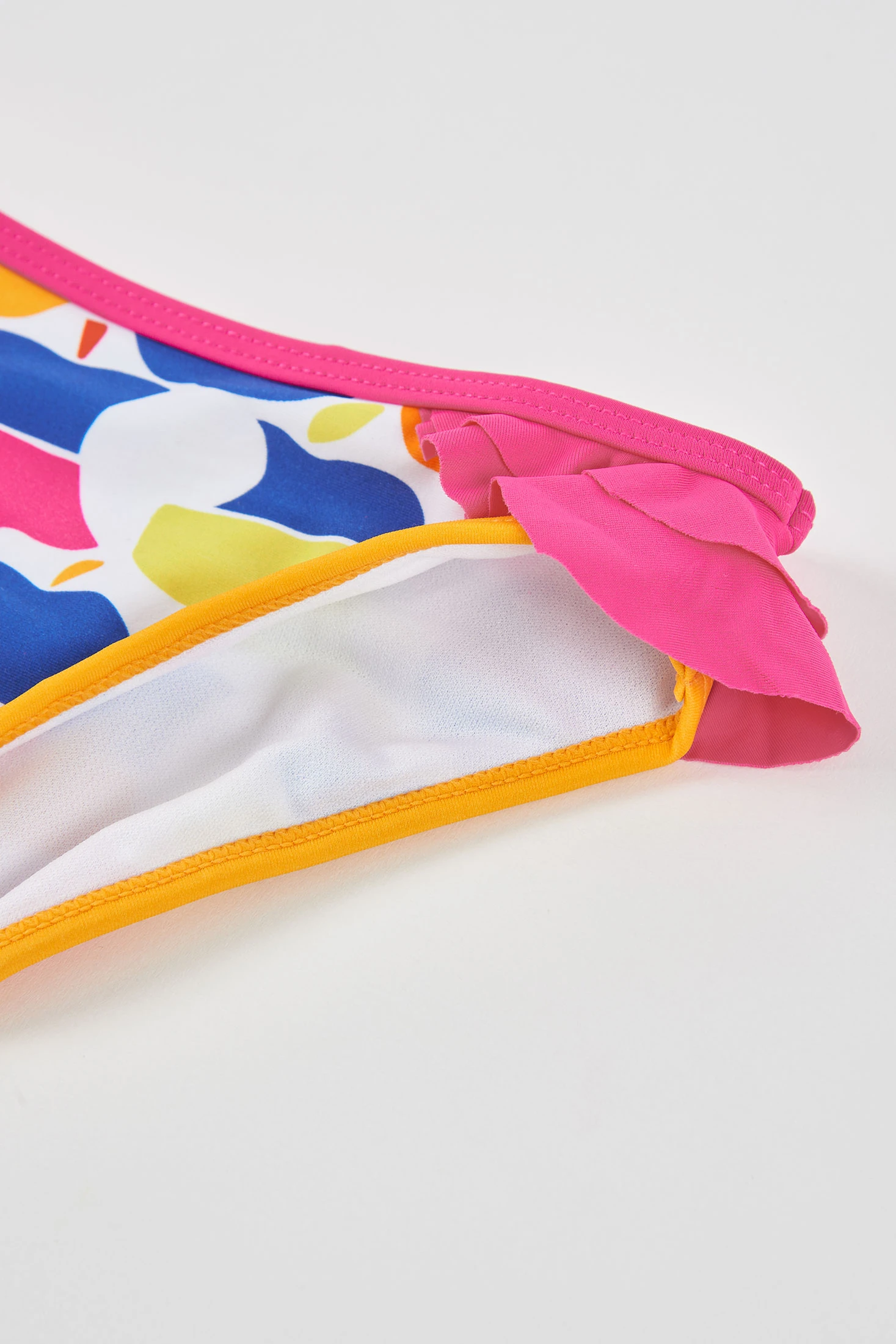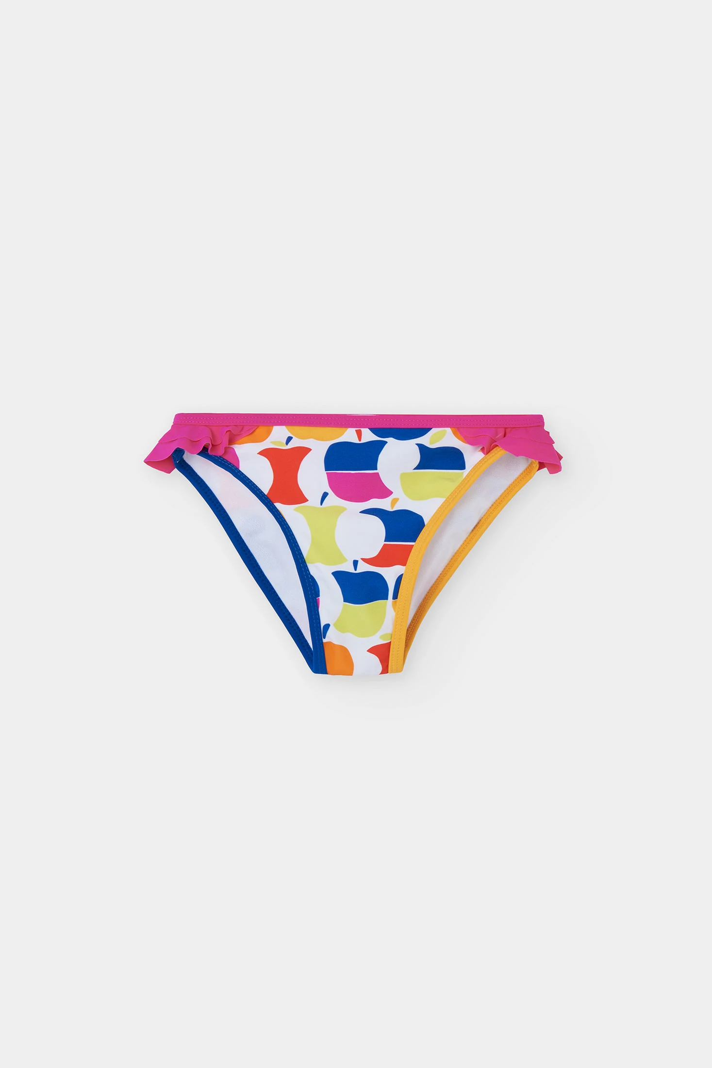 Mädchen-Badeanzug mit zertifiziertem UPF50+-Sonnenschutz, mit einem lebhaften Apfeldruck in Blau, Rosa, Gelb und Rot auf weißem Hintergrund. Die Nähte in Rosa und Tiefblau verleihen dem Design einen lustigen Touch. Aus elastischem Material gefertigt, das Komfort am Strand oder Pool garantiert. Erhältlich in Größen von 12 Monaten bis 14 Jahren für einen sicheren und bequemen Sitz.