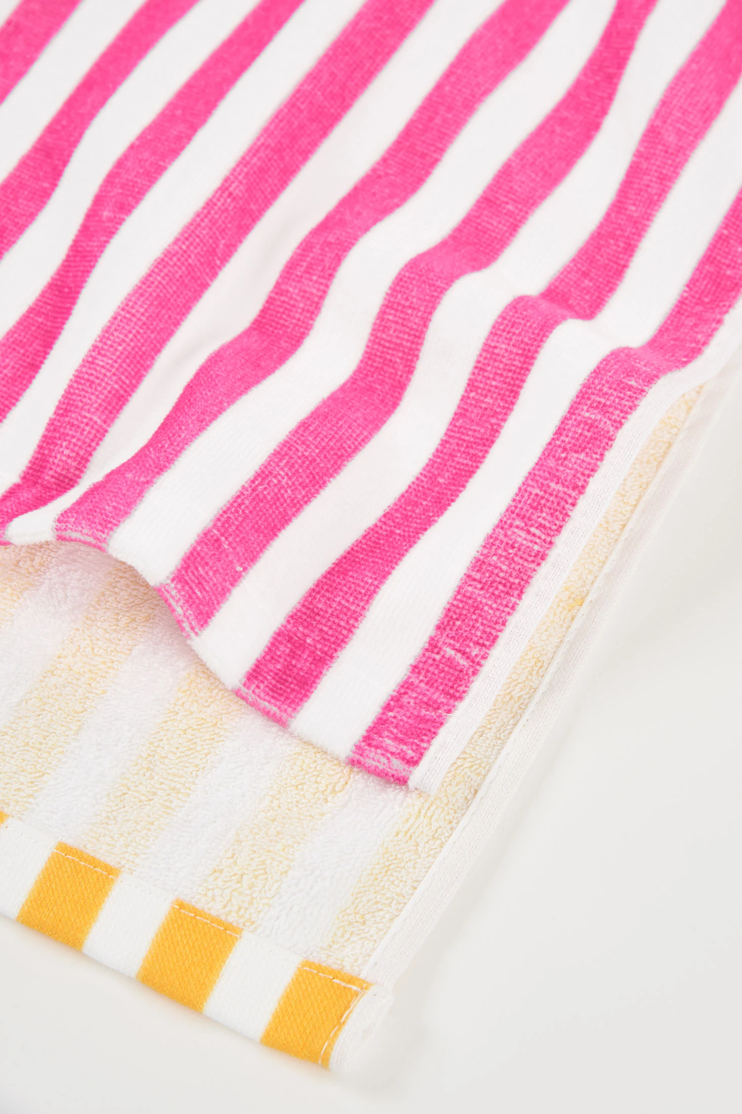 Gestreiftes Kapuzentuch aus weichem Frottee für Mädchen, ideal, um Ihre Kleine nach dem Bad warmzuhalten. Hergestellt aus weichem Frottee für höchsten Komfort. Es hat ein Streifendesign in Rosa- und Weißtönen mit bunten Fruchtmotiven, die einen spielerischen Akzent setzen. Perfekt für Kinder von 0 Monaten bis 2 Jahren. Die blau-weiß gestreifte Kapuze bietet zusätzlichen Schutz vor Kälte. Mit ihrem lebendigen und gemütlichen Stil ist es eine praktische Wahl, um die Badezeit für Ihr Mädchen noch angenehmer zu gestalten.
