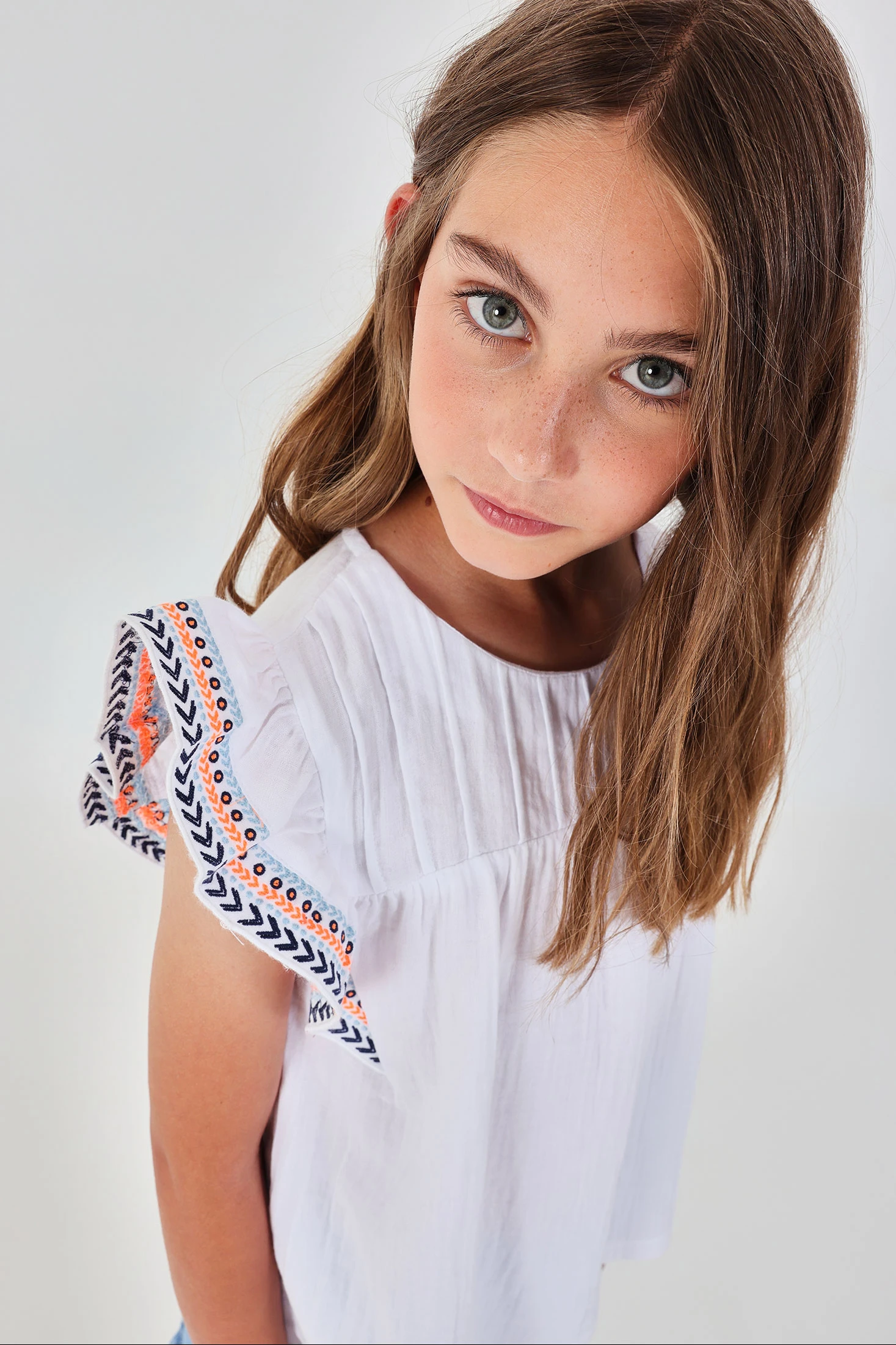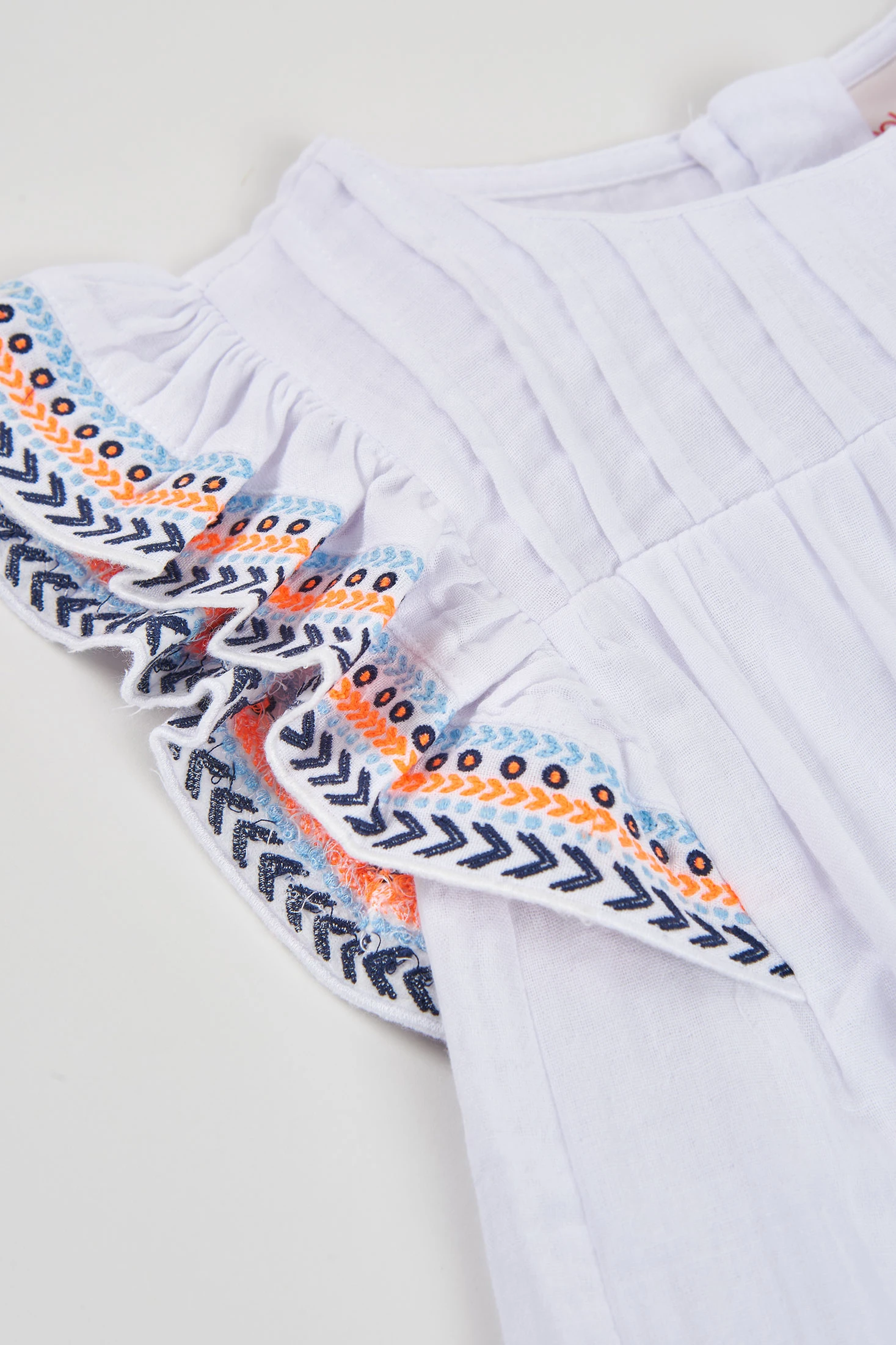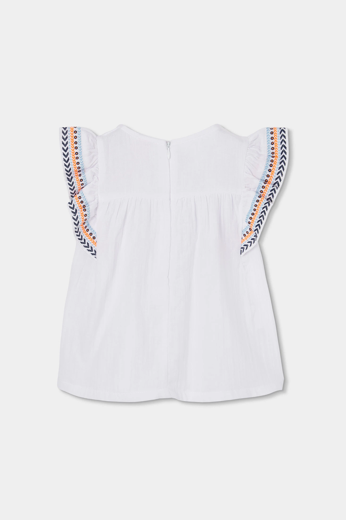 Weißer Fantasy-Stoff-Überwurf für Mädchen, ideal für sonnige Tage. Sein leichtes und frisches Material ist perfekt für den Sommer. Besonders hervorzuheben sind die Ärmel mit bestickten Details in lebhaften Farben, die eine lustige und elegante Note hinzufügen. Erhältlich in Größen von 12 Monaten bis 14 Jahren. Dieser Überwurf passt perfekt zu Shorts oder Röcken für einen lässigen, aber stilvollen Look zu jedem Anlass.