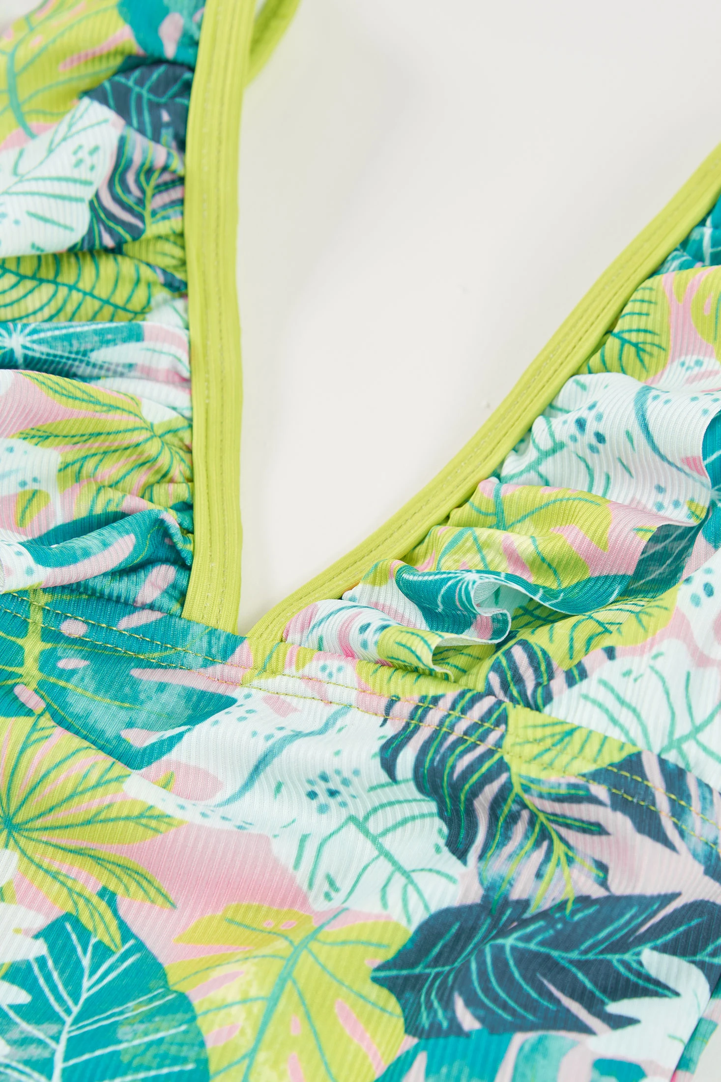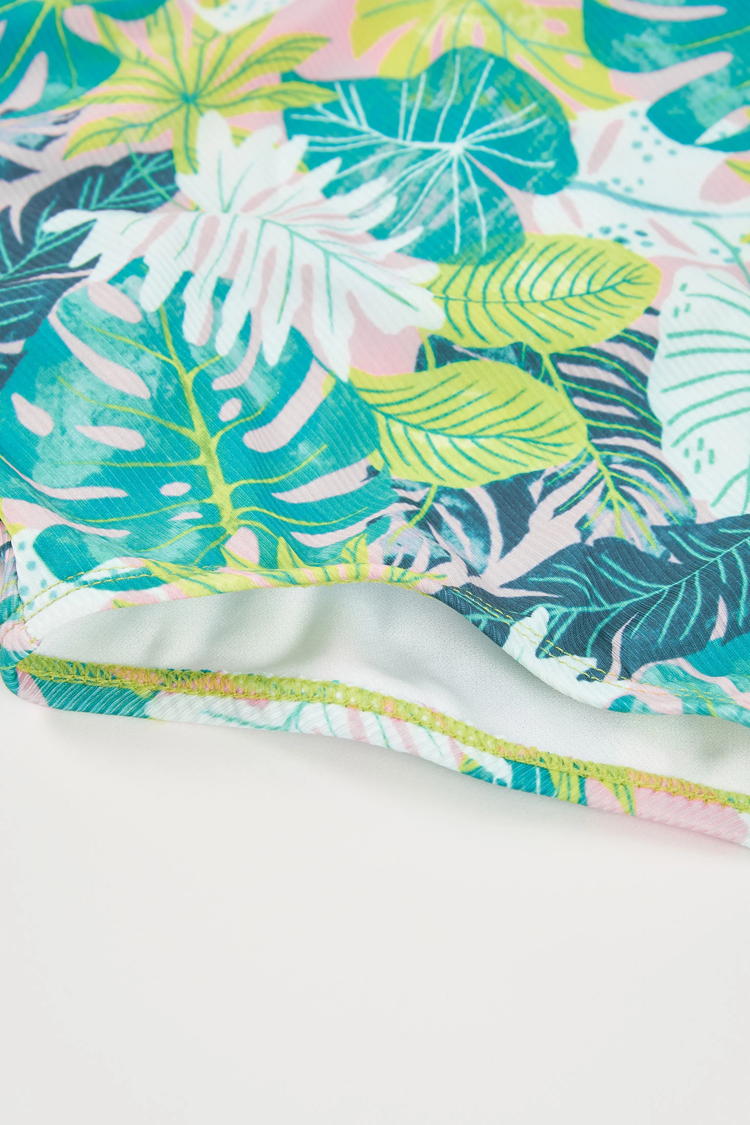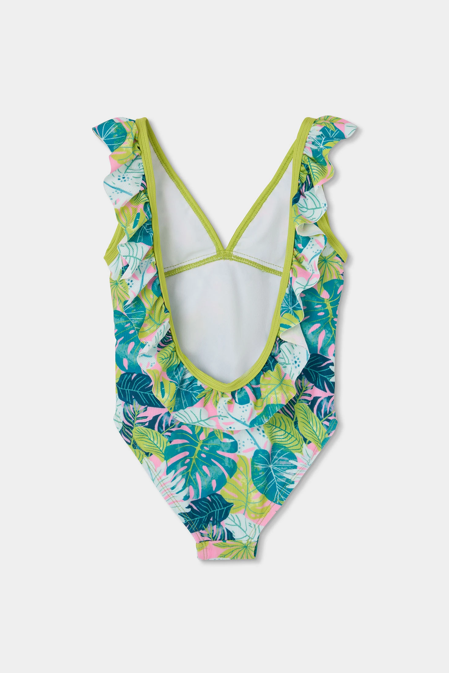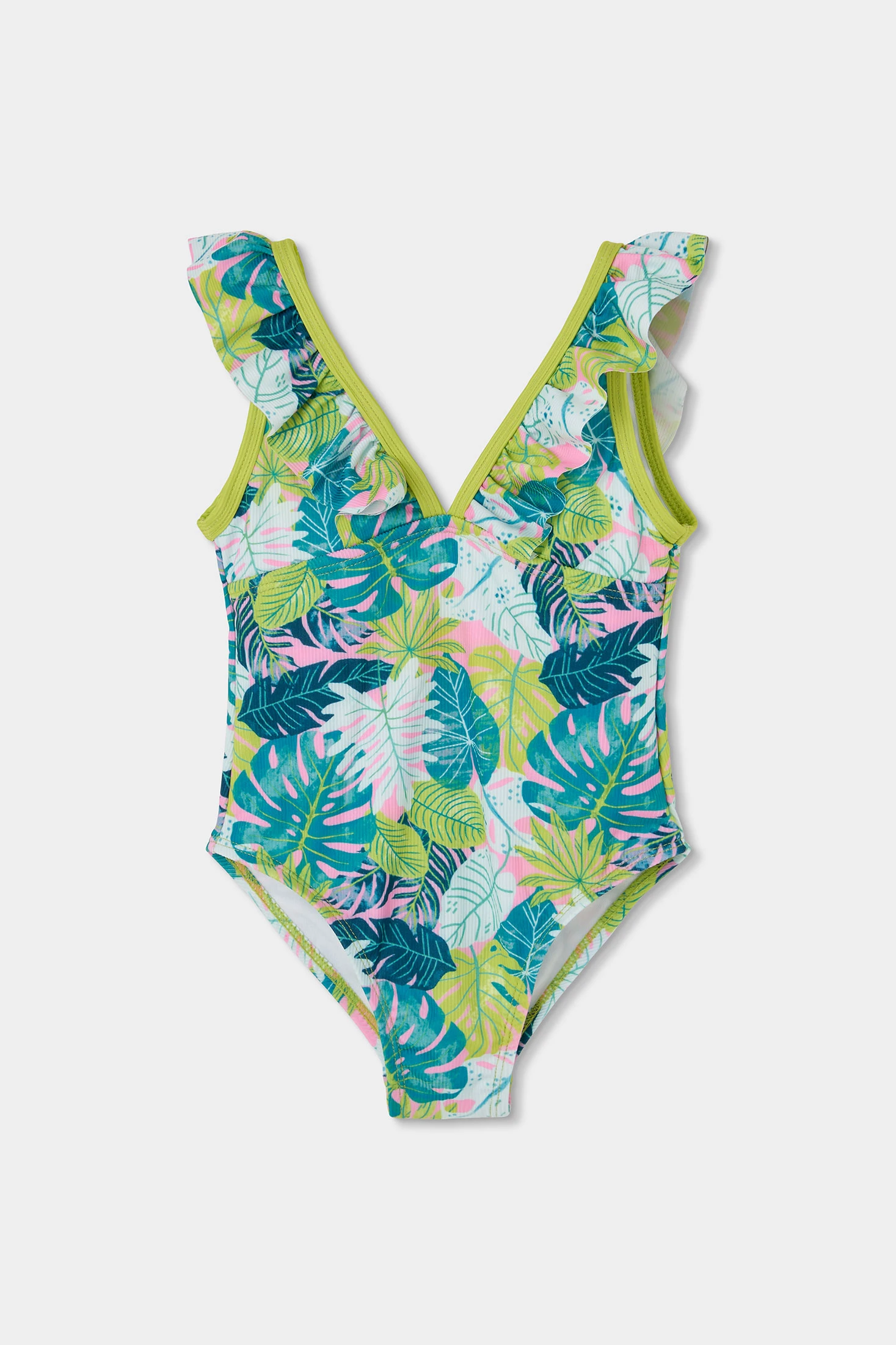 Bedruckter Badeanzug für Mädchen, perfekt für den Sommer. Mit einem fröhlichen Design aus tropischen Blättern in Grün-, Blau- und Rosatönen verleiht er einen lebendigen und erfrischenden Akzent. Hergestellt aus elastischem Material mit UPF50-Sonnenschutz, das Komfort und Bewegungsfreiheit garantiert. Das Rüschen-Detail an den Trägern fügt einen spaßigen und modernen Touch hinzu. Erhältlich in den Größen von 2 bis 14 Jahren, ist er ideal, um den Pool oder Strand stilvoll zu genießen.