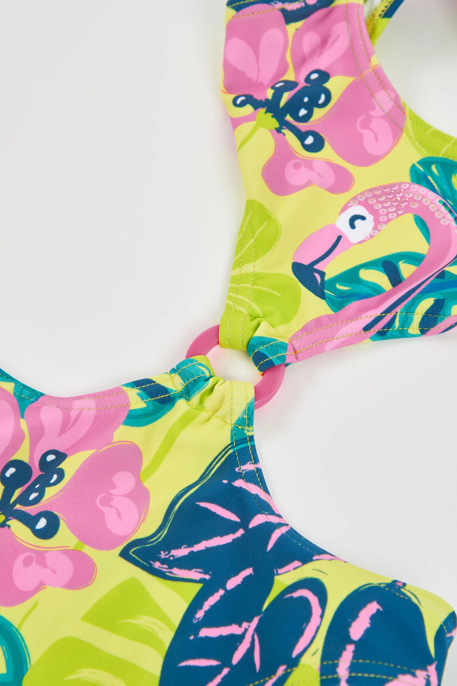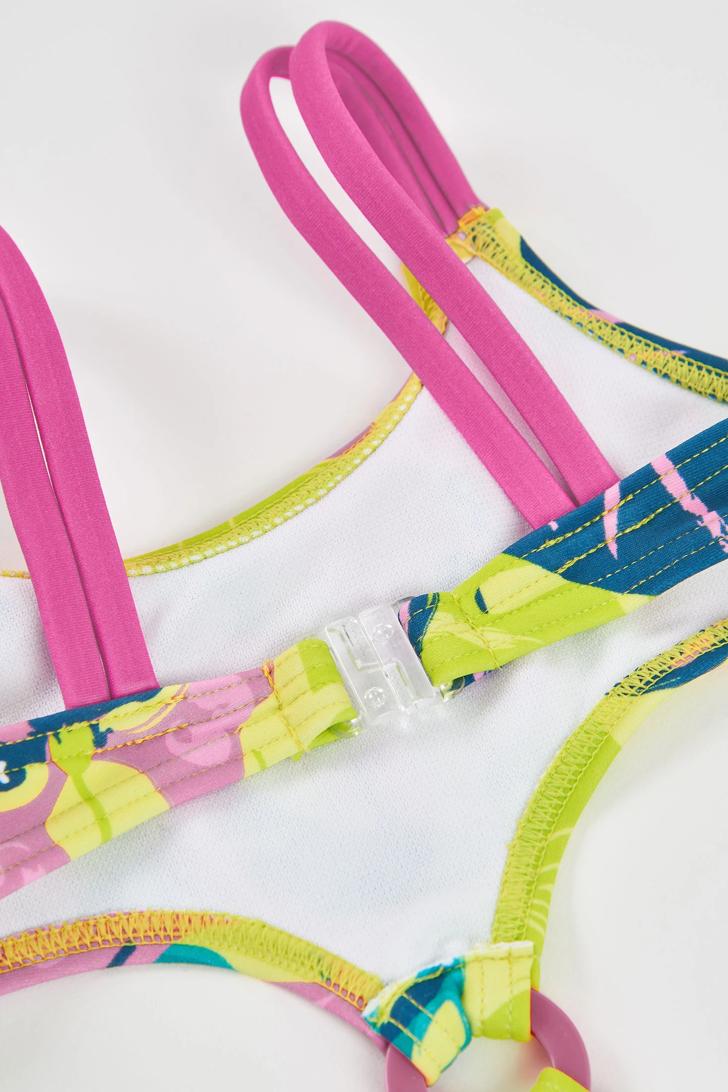 Trikini für Mädchen in Grün mit Print, entworfen, um den Sommer in vollen Zügen zu genießen. Der elastische, chlorresistente Stoff bietet Komfort und Langlebigkeit, während die schmalen Träger eine perfekte Passform gewährleisten. Ideal für Pool oder Strand – ein modernes und verspieltes Kleidungsstück, erhältlich in den Größen von 2 bis 14 Jahren.