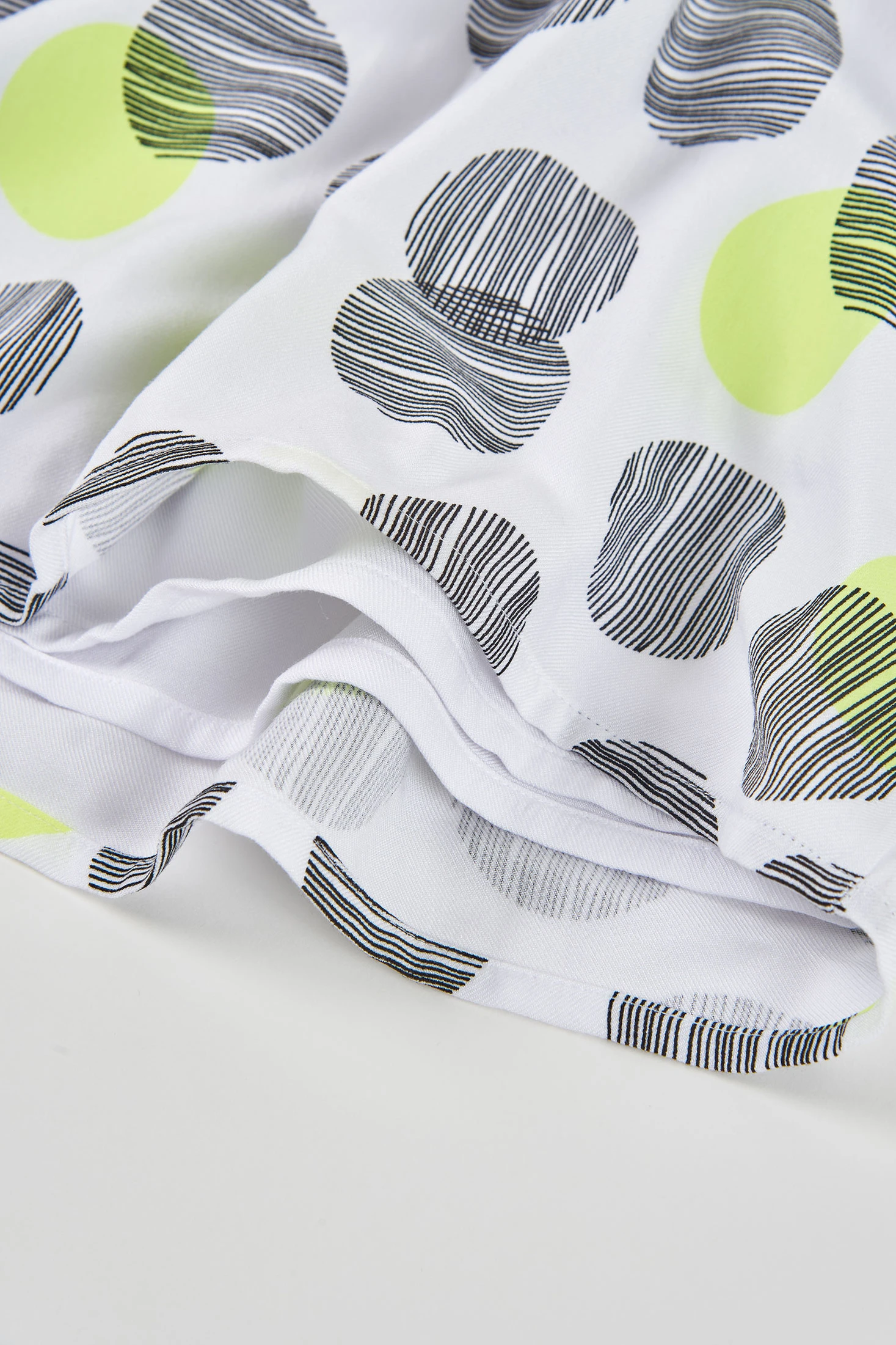 Mädchenkleid mit einem Kreisprint in Schwarz und Neongrün auf weißem Hintergrund, das ein modernes und lustiges Design bietet. Aus weichem und bequemem Material gefertigt, ideal für den täglichen Gebrauch im Frühling und Sommer. Sein ärmelloses Design und der seitliche Volant verleihen einen markanten Touch. Erhältlich in Größen von 2 bis 14 Jahren, passt es sich verschiedenen Altersgruppen an. Perfekt, um mit bunten oder neutralen Accessoires zu kombinieren, eine vielseitige Wahl für jede besondere Gelegenheit oder den Alltag.