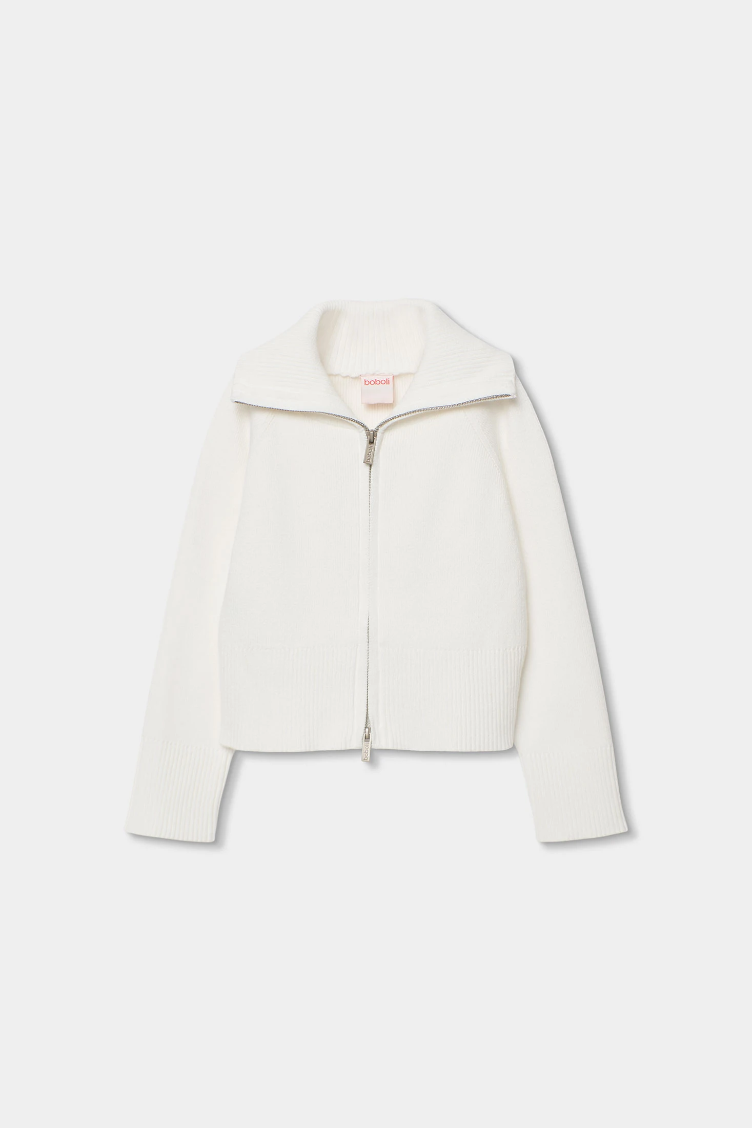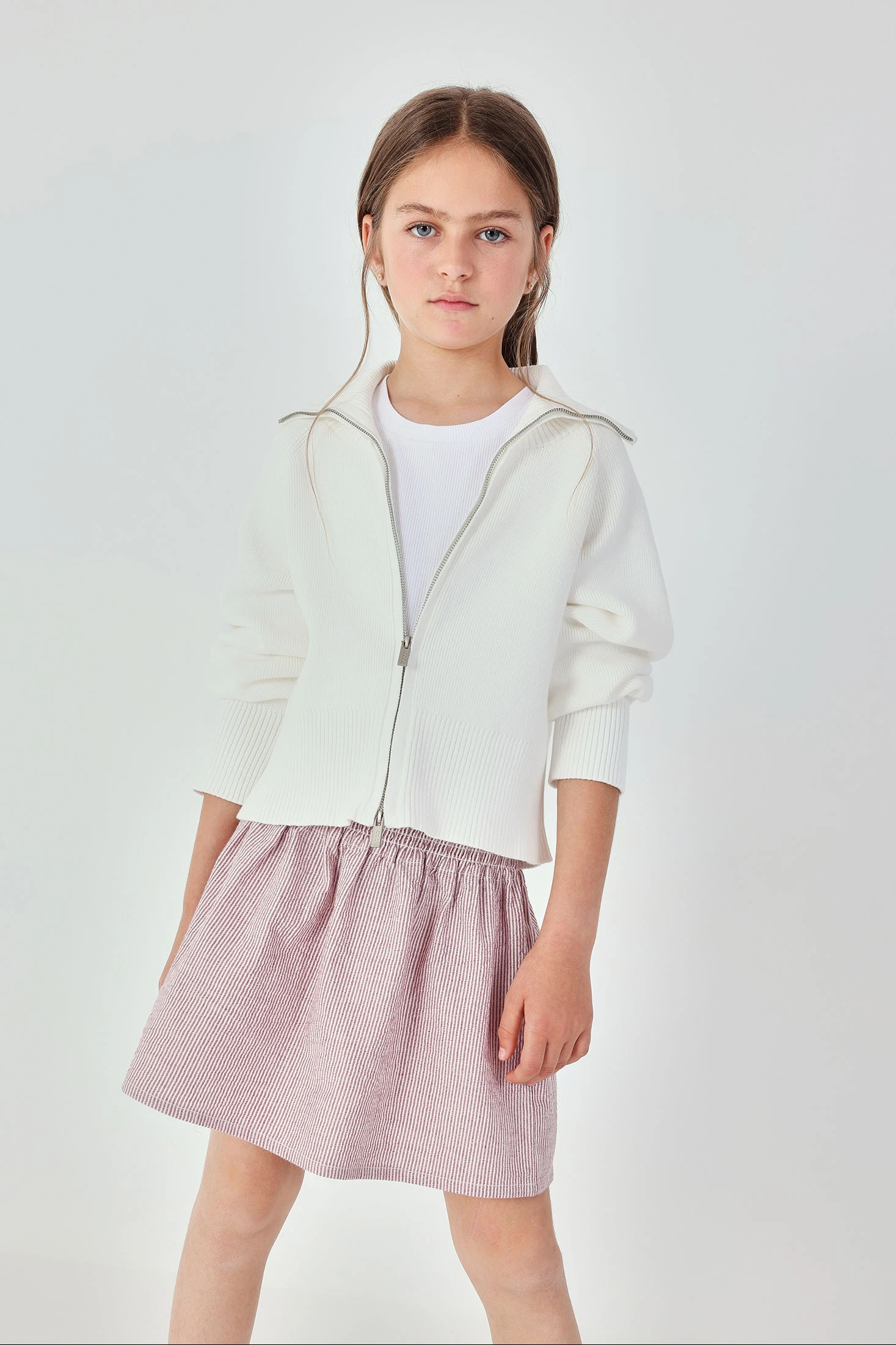 Weiße Strickjacke für Mädchen, perfekt für Frühling und Sommer. Hergestellt aus einem weichen Stoff, bietet sie Komfort und Wärme. Sie verfügt über ein schlichtes und elegantes Design mit Reißverschluss und hohem Kragen. Die langen Ärmel sorgen für Wärme an kühleren Tagen. Erhältlich in Größen von 2 bis 14 Jahren, ideal zum Kombinieren mit Jeans oder Leggings für einen lässigen und gemütlichen Look.
