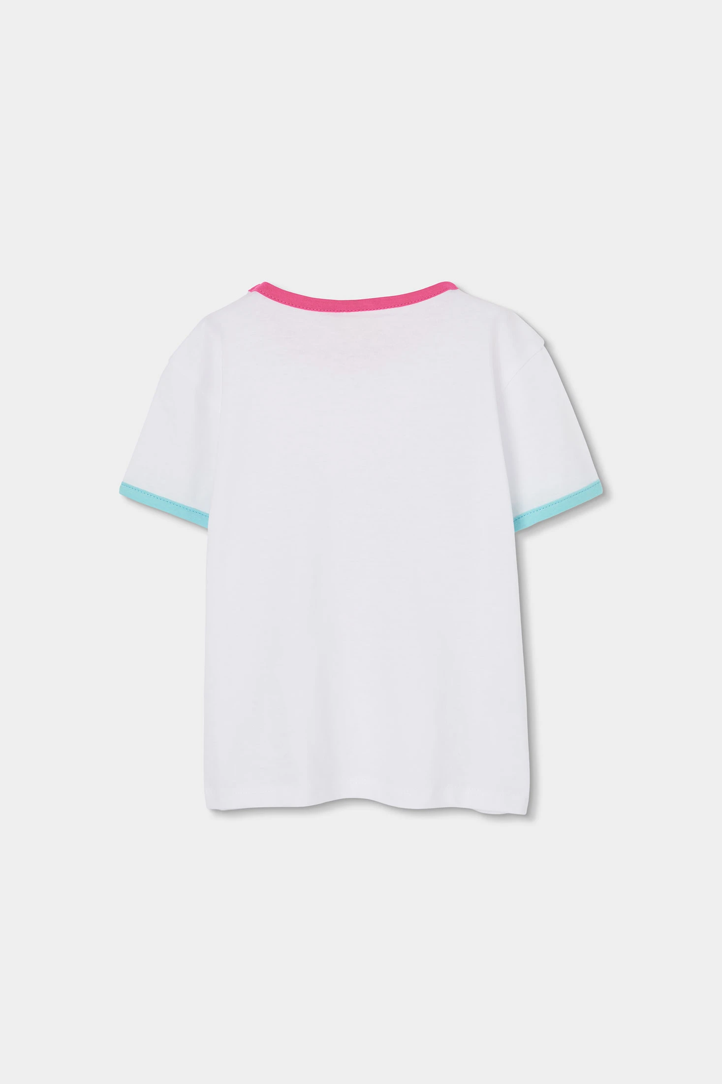 Elastisches Strick-T-Shirt für Mädchen, perfekt für den Alltag. Aus weißer Baumwolle gefertigt, bietet es Komfort und Bewegungsfreiheit. Es hat ein auffälliges grafisches Design auf der Vorderseite mit einer Sommerszene, in der ein Mädchen in einem Pool badet. Die Farben sind leuchtend blau und rosa. Das T-Shirt hat einen Rundhalsausschnitt und kurze Ärmel, was es leicht kombinierbar mit jeder Hose oder jedem Rock macht. Erhältlich in Größen von 2 bis 14 Jahren.