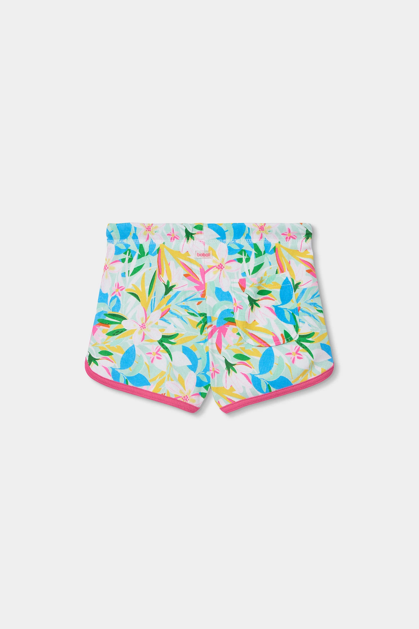Geripptes Shorts für Mädchen zeigt einen farbenfrohen Blumenprint, der ihm einen lebhaften und fröhlichen Touch verleiht. Aus leichtem und atmungsaktivem Material gefertigt, ist es ideal für den Sommer. Größen sind von 2 bis 14 Jahren erhältlich. Das Design beinhaltet einen praktischen elastischen Bund mit Kordelzug, der einen bequemen Sitz garantiert. Rosafarbene Paspeln heben sich ab und fügen ein modernes Detail hinzu. Perfekt kombinierbar mit einfachen T-Shirts oder leichten Blusen, bietet es einen frischen und lustigen Stil für sonnige Tage.