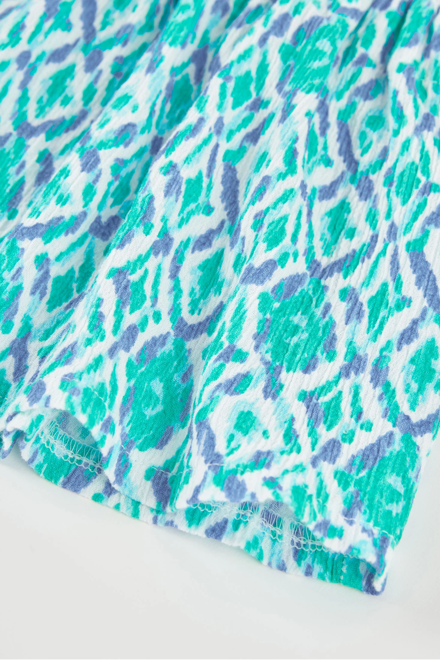 Bedruckter Rock für Mädchen, ideal für die warmen Jahreszeiten. Hergestellt aus leichtem Crinkle-Gewebe, bietet er Komfort und Frische. Sein Design zeigt einen ethnischen Druck in Blau- und Grüntönen, perfekt, um dem Kinderkleiderschrank Farbe zu verleihen. Erhältlich in Größen von 2 bis 14 Jahren. Seine Verarbeitung ermöglicht Bewegungsfreiheit, ideal für das tägliche Spielen.