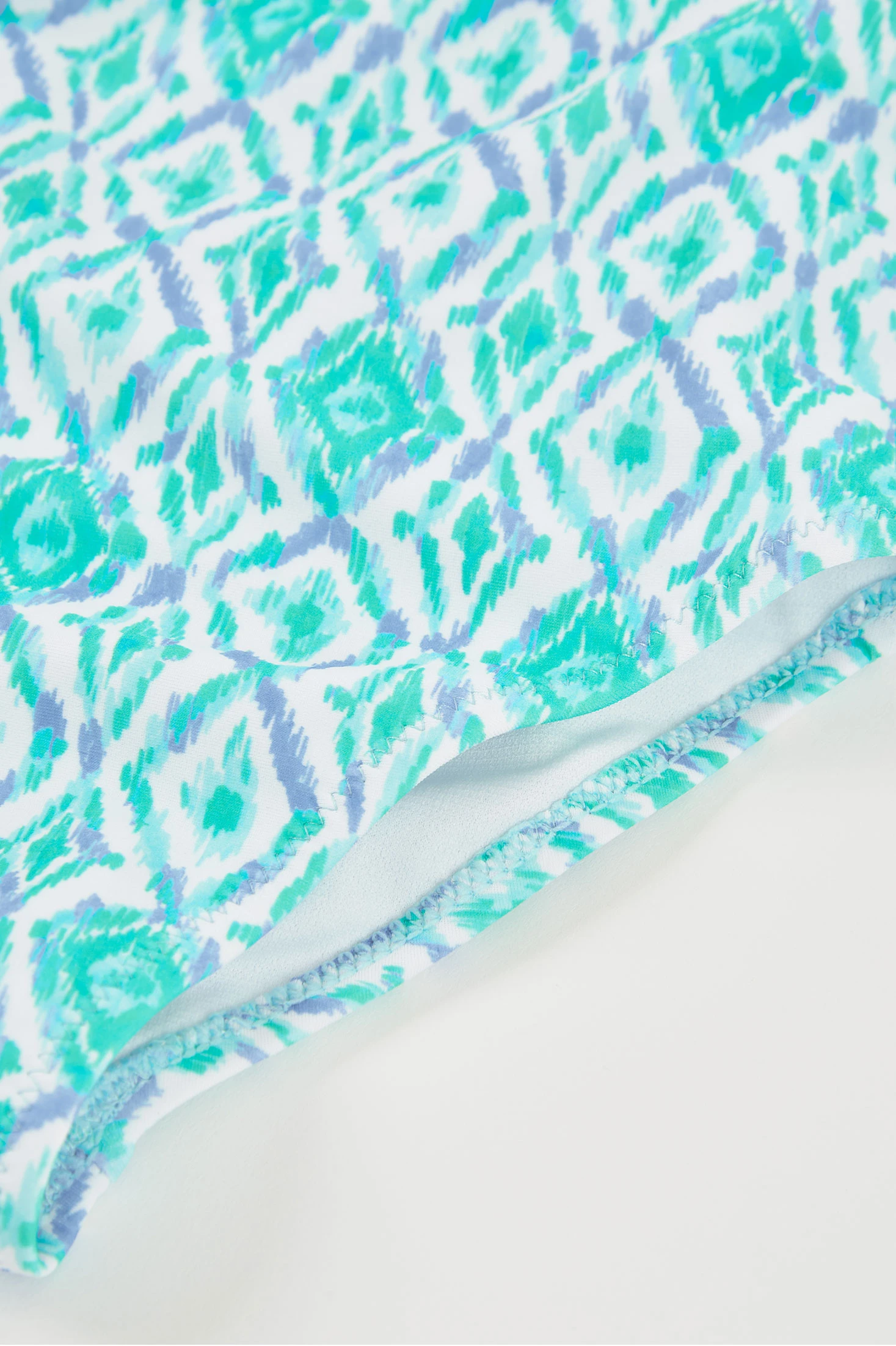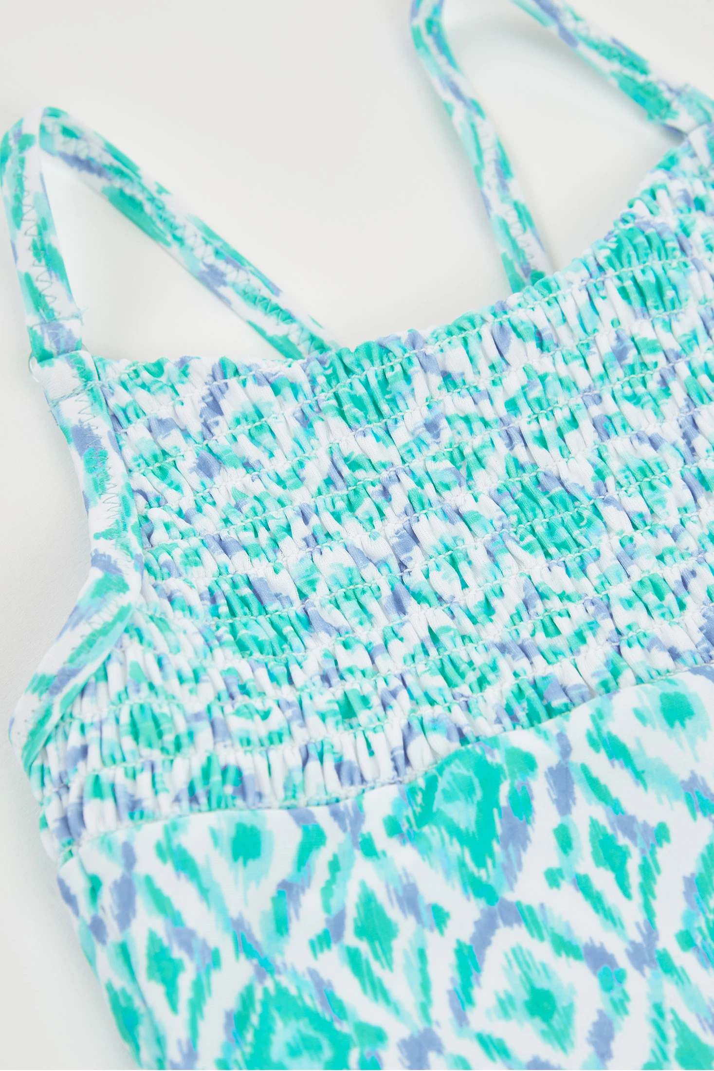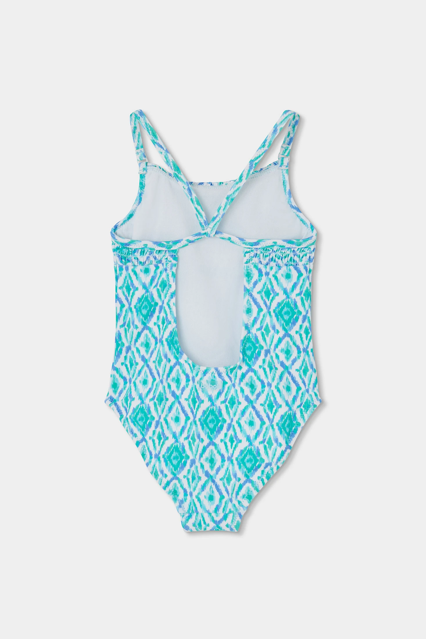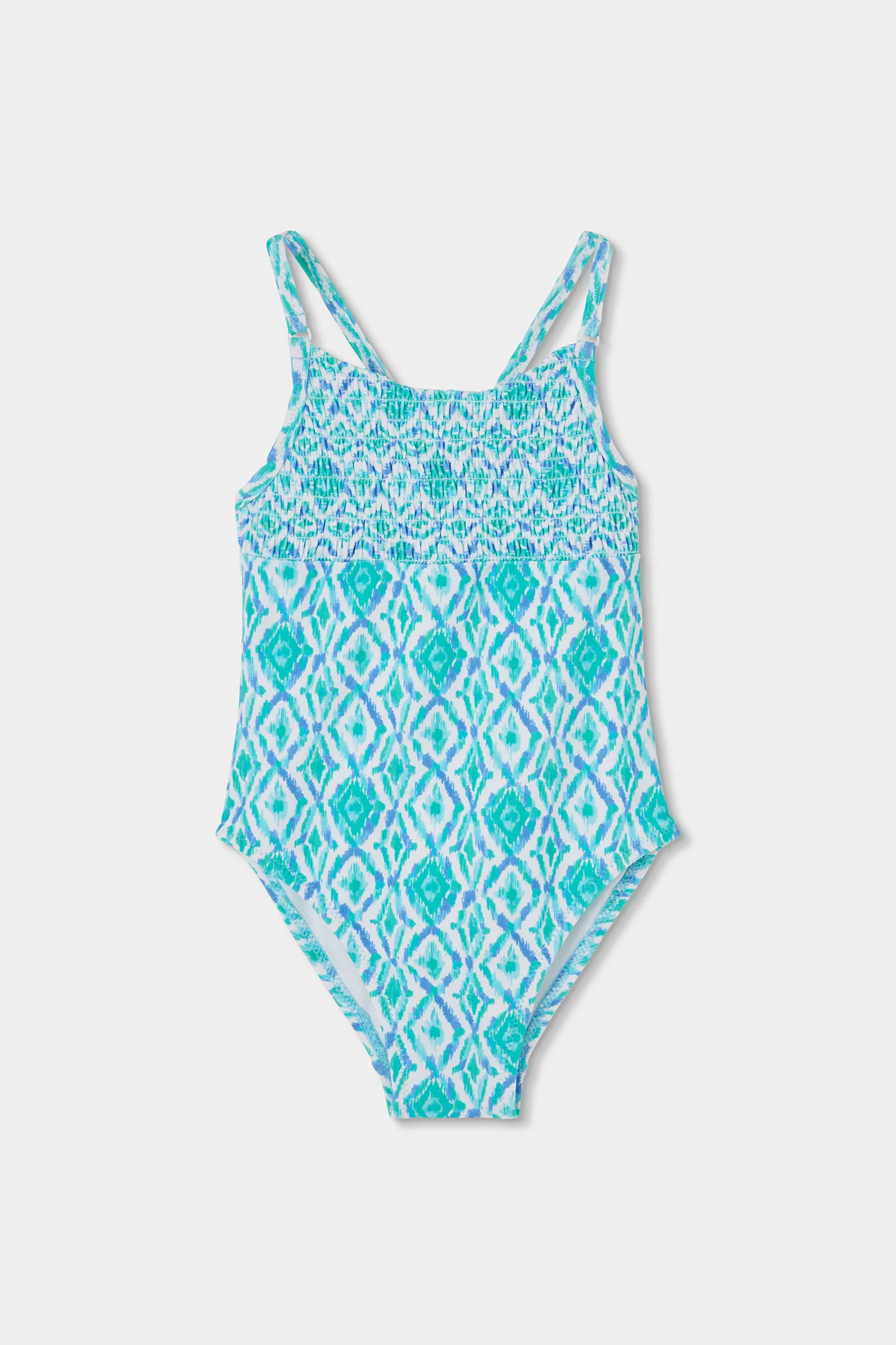 Bedruckter Badeanzug für Mädchen, perfekt zum Genießen im Wasser. Hergestellt aus widerstandsfähigem Material mit UPF50 Sonnenschutz und bequemem Sitz, bietet er einen sicheren Halt zum Schwimmen und Spielen. Das Design zeigt ein Muster mit ethnischen Motiven in Blau- und Grüntönen, das dem Kleidungsstück einen verspielten Touch verleiht. Erhältlich in Größen von 2 bis 14 Jahren und passt sich unterschiedlichen Altersgruppen an. Die dünnen Träger bieten Bewegungsfreiheit. Er ist die ideale Wahl für den Strand oder das Schwimmbad und sorgt für Komfort und Frische im Sommer.