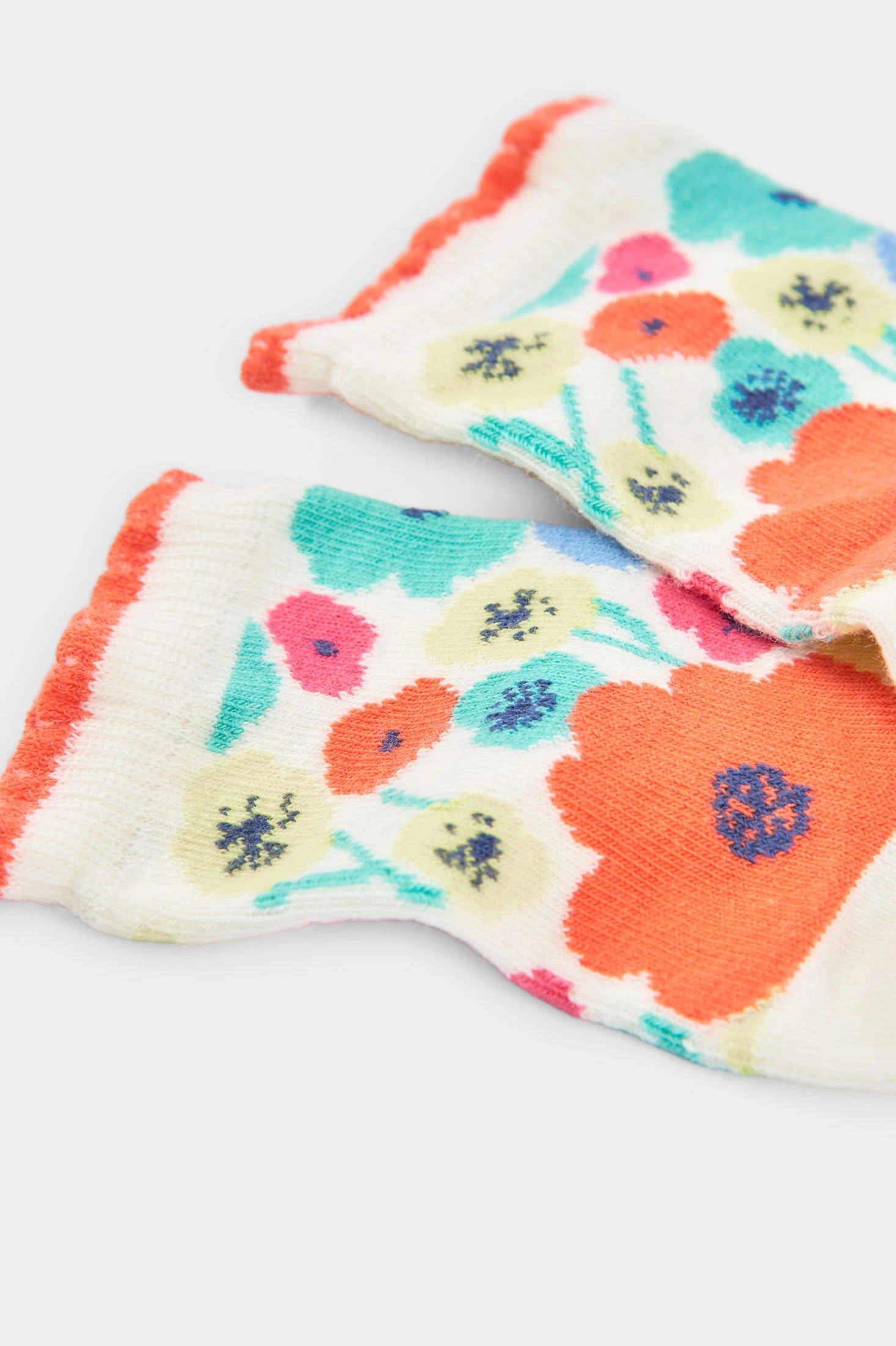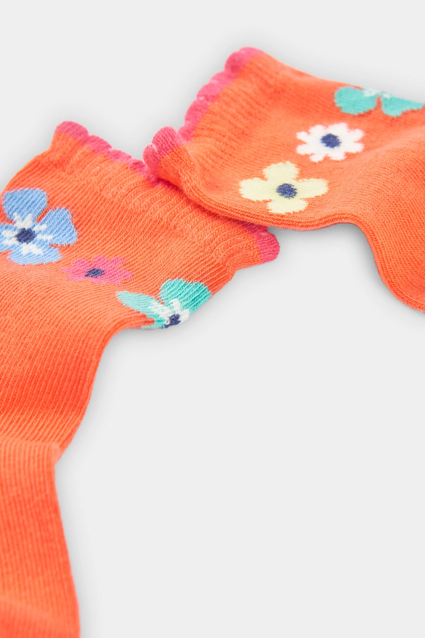 Baumwollsocken-Set für Mädchen, ideal für alle Jahreszeiten. Aus weicher Baumwolle gefertigt, garantieren sie Komfort für die Kleinen. Das Set enthält farbenfrohe Designs, eines mit Blumen auf orangem Hintergrund und eines mit Blumen auf weißem Hintergrund. Erhältlich in den Größen 19/21 bis 37/39, passend für 12 Monate bis 12 Jahre. Ihr fröhliches und vielseitiges Design ergänzt jedes Outfit und verleiht jedem Kleidungsstück einen Hauch von Spaß und Stil. Perfekt, um Kinderfüße warm und bequem zu halten.