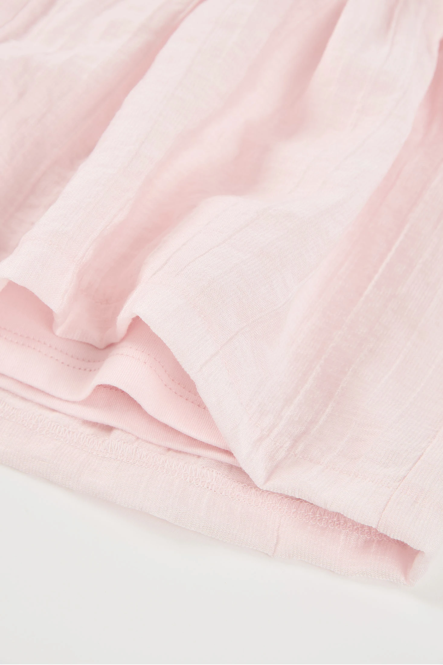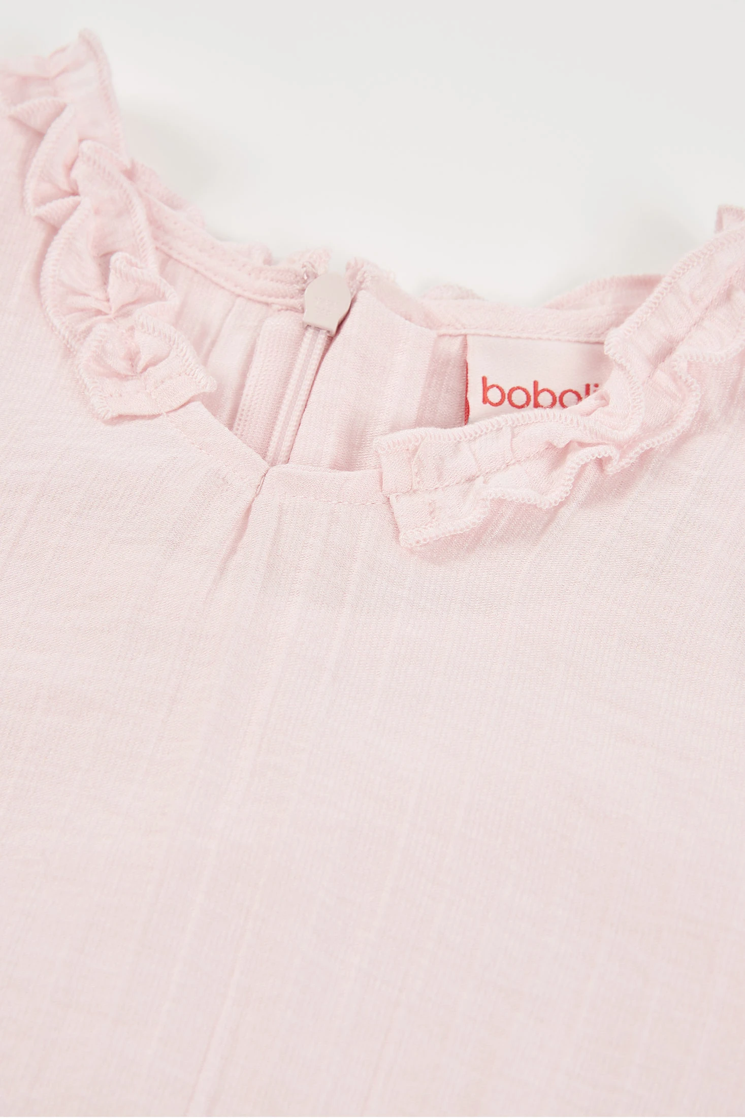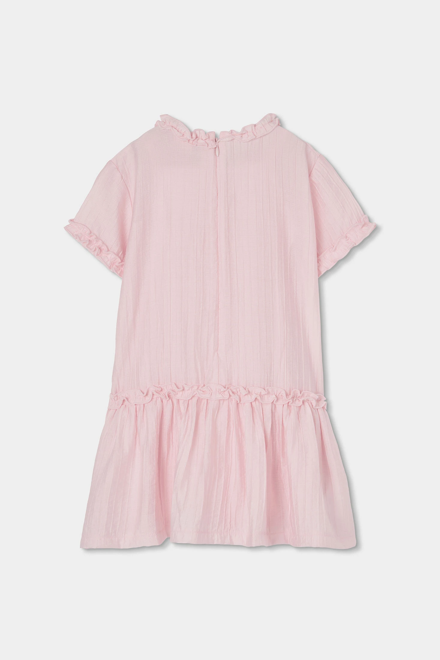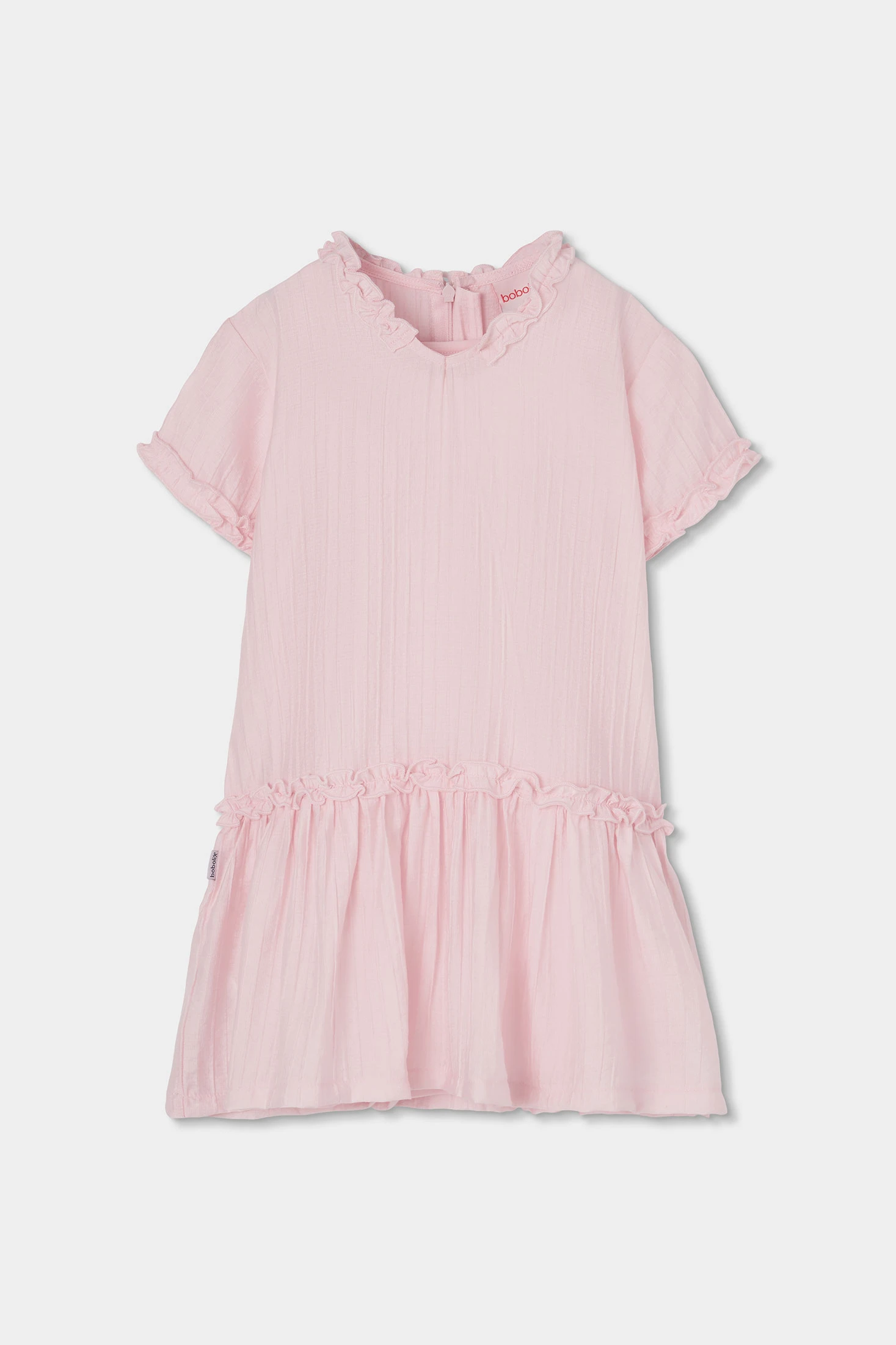Rosa Kleid für Mädchen mit einem bezaubernden Design, verziert mit Rüschen am Kragen und an der Taille. Hergestellt aus einem weichen und leichten Material, ideal für besondere Anlässe oder Sommertage. Erhältlich in Größen von 12 Monaten bis 8 Jahren. Die Pastellrosa-Farbe verleiht eine süße und feminine Note, während die kurzen Ärmel in warmem Klima Komfort bieten. Kombiniere es mit einfachen Accessoires, um das zarte Design zu betonen.