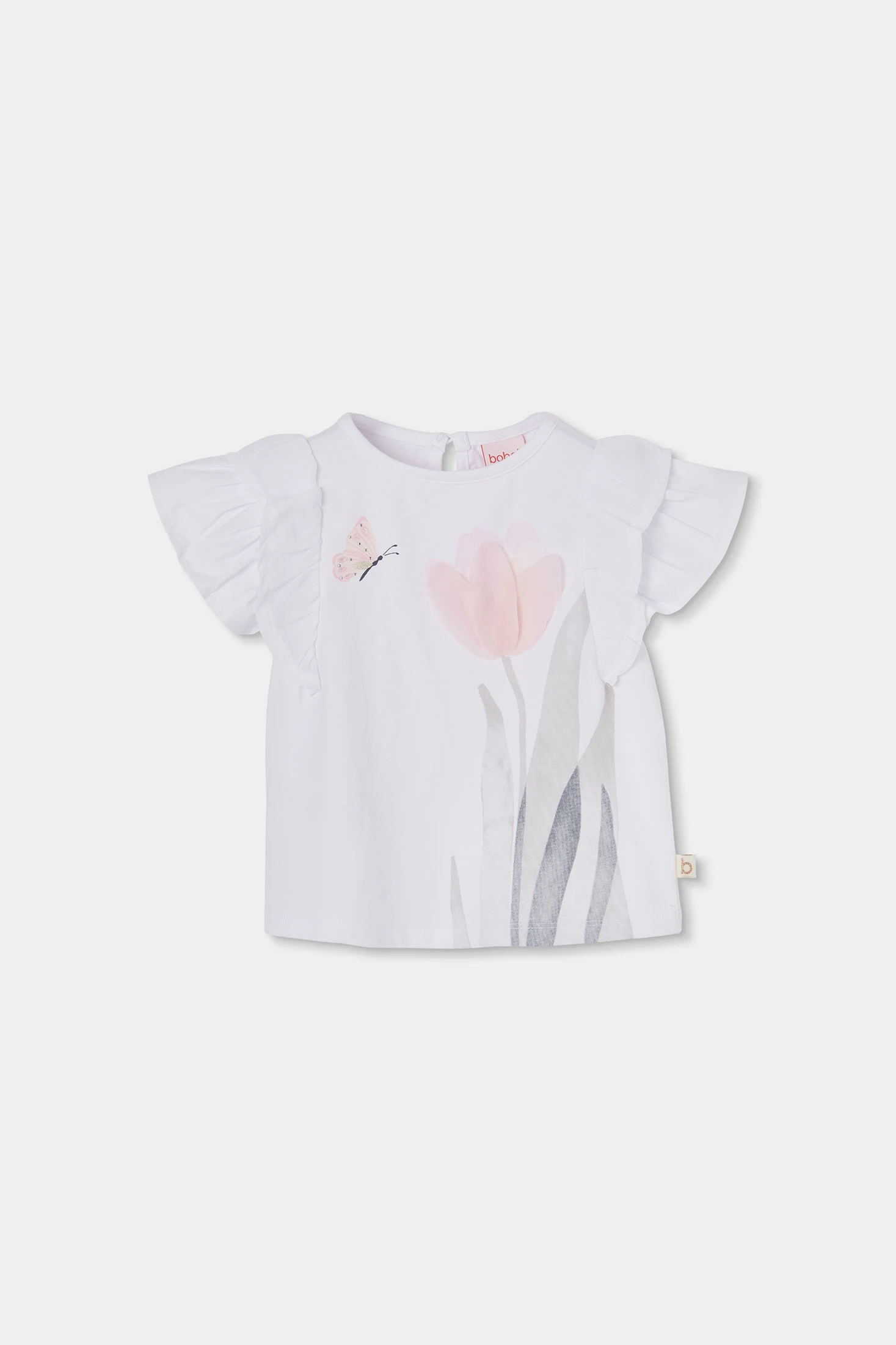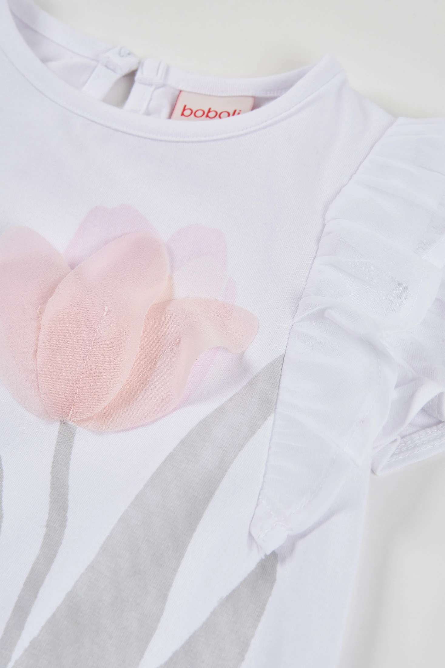 Weißes Strick-T-Shirt für Mädchen, ideal für die Kleinsten, erhältlich in Größen von 12 Monaten bis 10 Jahren. Hergestellt aus einem weichen Stoff, zeigt es einen zarten Blumenprint mit einer Chiffonapplikation auf der Blume. Das Design beinhaltet kurze Ärmel mit Rüschen und verleiht einen eleganten und frischen Stil. Seine Vielseitigkeit ermöglicht es, es problemlos mit verschiedenen Stilen für ungezwungene oder formellere Anlässe zu kombinieren.