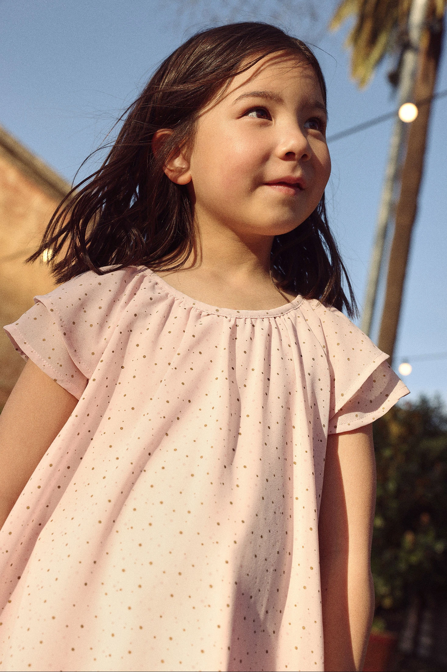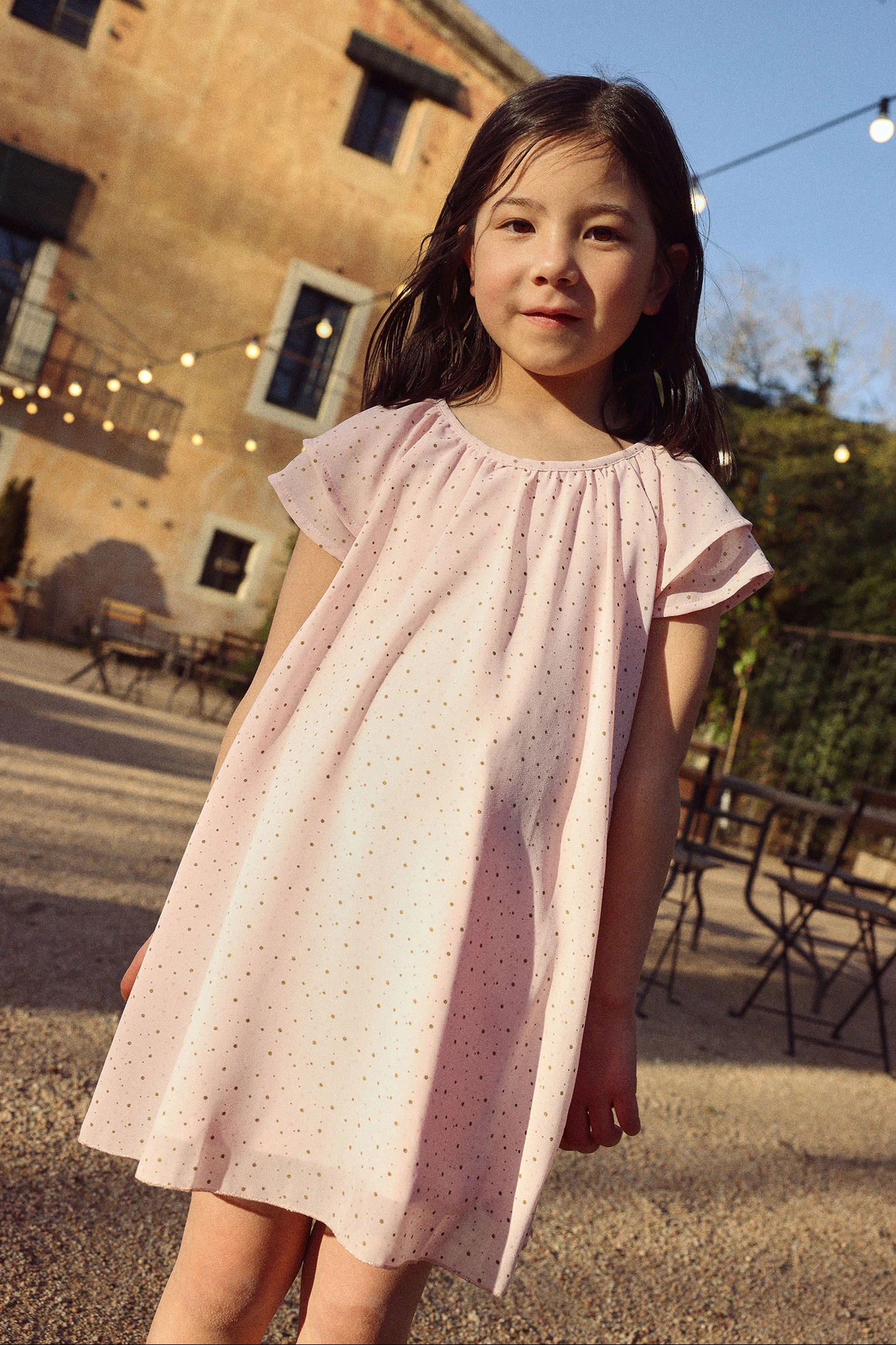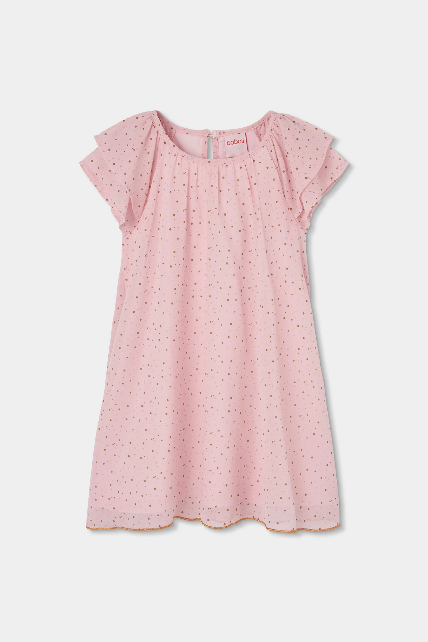 Bedrucktes Chiffonkleid, perfekt für Mädchen von 12 Monaten bis 10 Jahren. Sein leichtes und fließendes Design in Rosa zeigt ein zartes Muster aus kleinen goldenen Punkten auf dem gesamten Kleidungsstück. Die kurzen Ärmel mit leichten Rüschen verleihen einen eleganten Touch, ideal für besondere Anlässe. Aus einem weichen und atmungsaktiven Material gefertigt, gewährleistet es den ganzen Tag über Komfort. Ideal, um mit einfachen Accessoires kombiniert zu werden und einen schicken Look in jeder Saison zu kreieren.