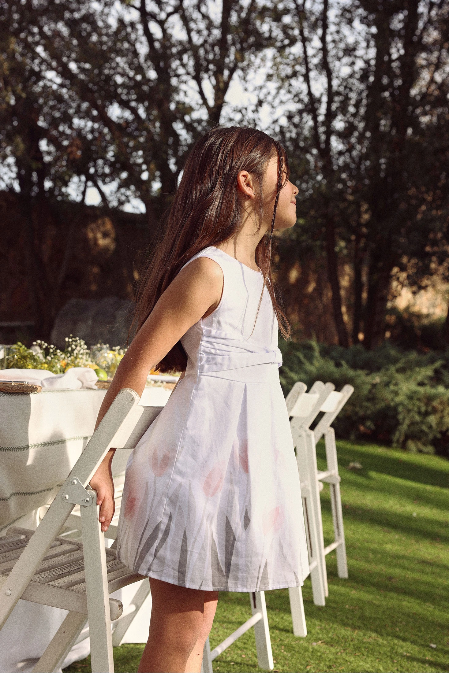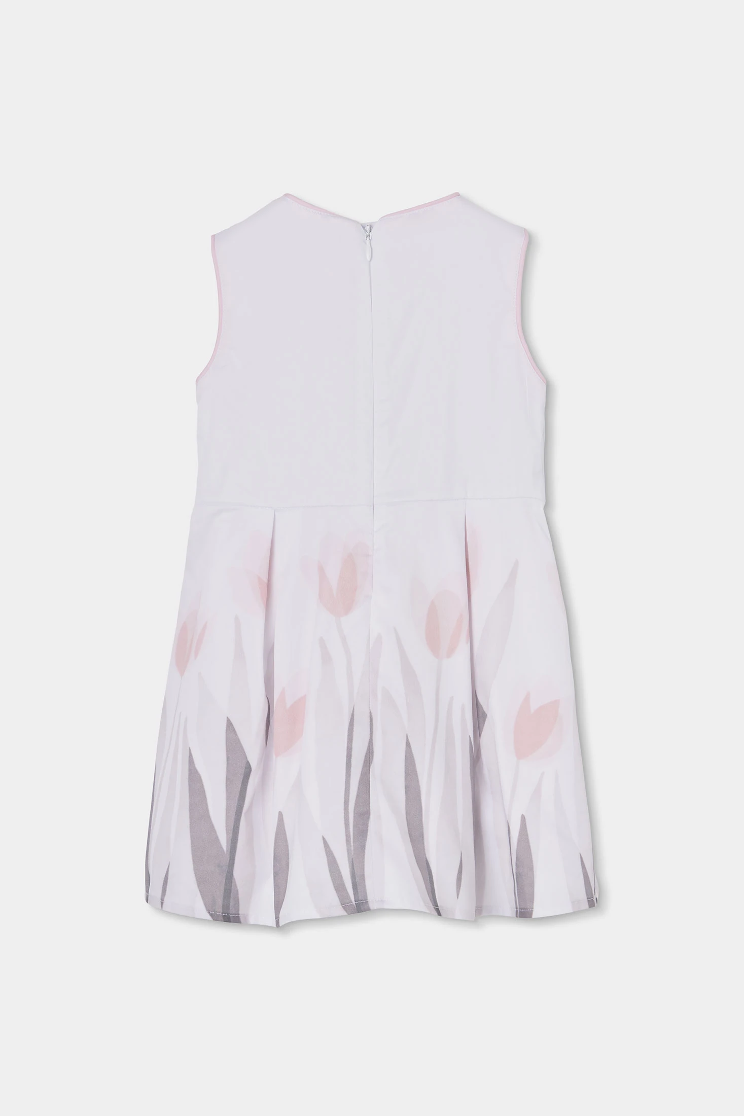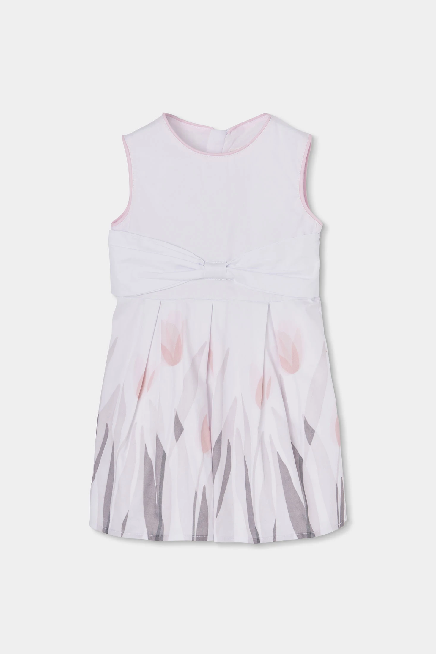 Elegantes weißes ärmelloses Satinkleid, perfekt für besondere Anlässe. Das Design umfasst zarte Blumendetails in Rosatönen und Grau. Aus Satin gefertigt, bietet es ein weiches und glänzendes Finish. Erhältlich in Größen von 12 Monaten bis 10 Jahren, passt es sich dem Wachstum der Kleinen an. Ideal für formelle Outfits, macht es sein makelloser Stil zu einer herausragenden Wahl für Veranstaltungen.