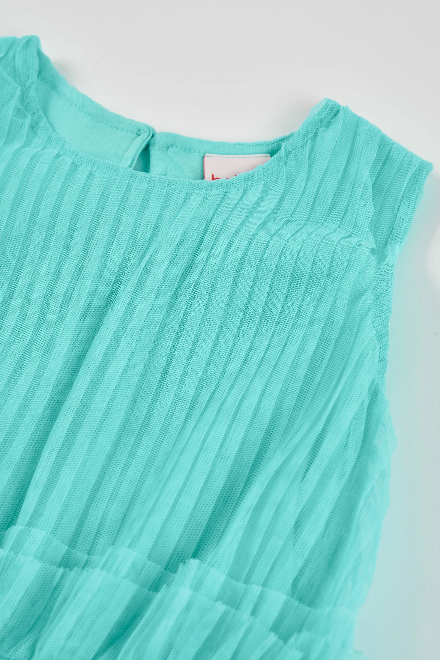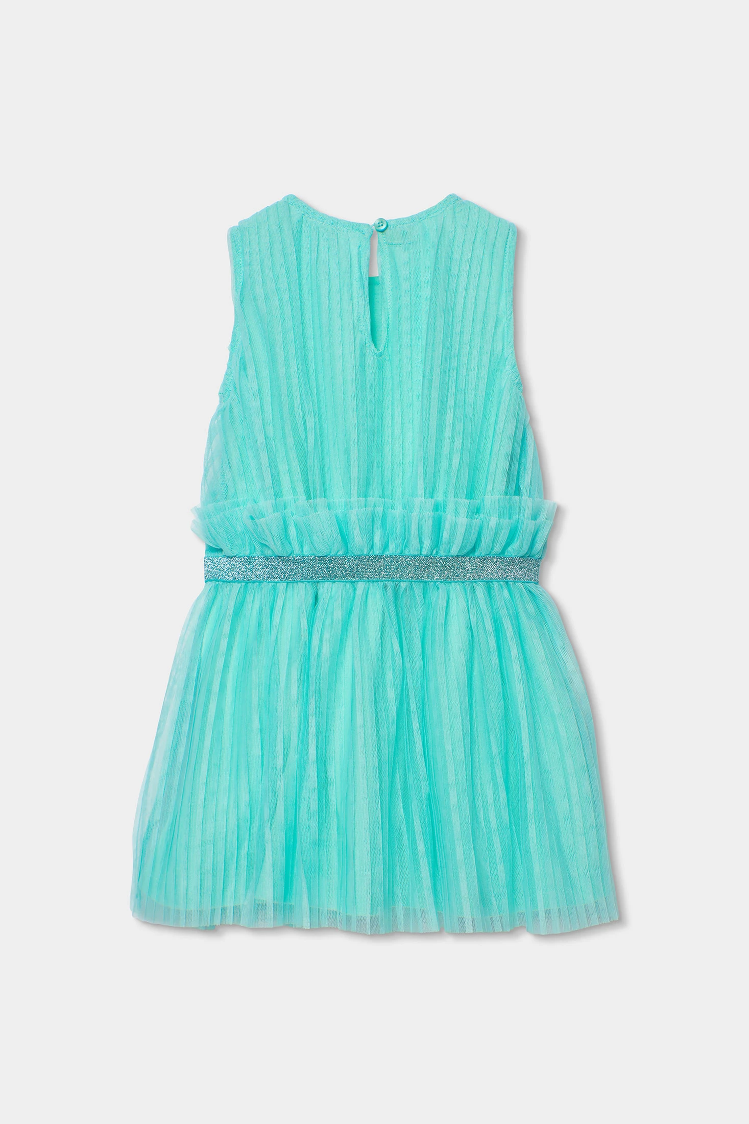 Plissiertes Tüllkleid in Türkisgrün, ideal für besondere Anlässe. Hergestellt aus einem leichten und bequemen Material, verfügt es über ein ärmelloses Design mit einem glänzenden silbernen Bund, der dem Kleidungsstück eine elegante Note verleiht. Erhältlich in Größen von 12 Monaten bis 10 Jahren. Der Stoff ermöglicht freie Bewegungen, perfekt, um es bequem zu halten, während sie spielt oder tanzt. Sein schicker Look lässt sich gut mit leichten Jacken oder zarten Accessoires kombinieren, was es zu einer vielseitigen und stilvollen Wahl für jede Veranstaltung macht.