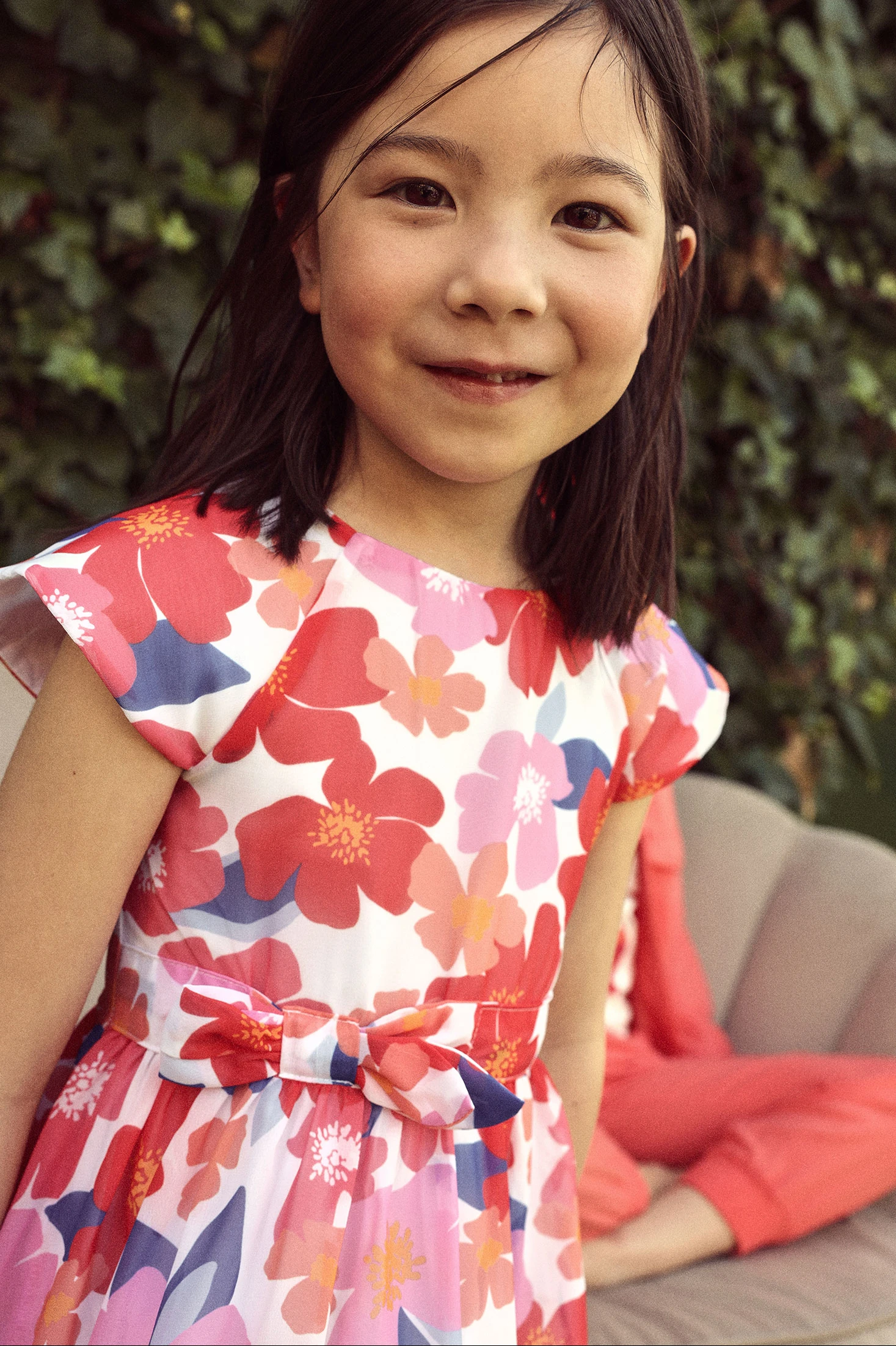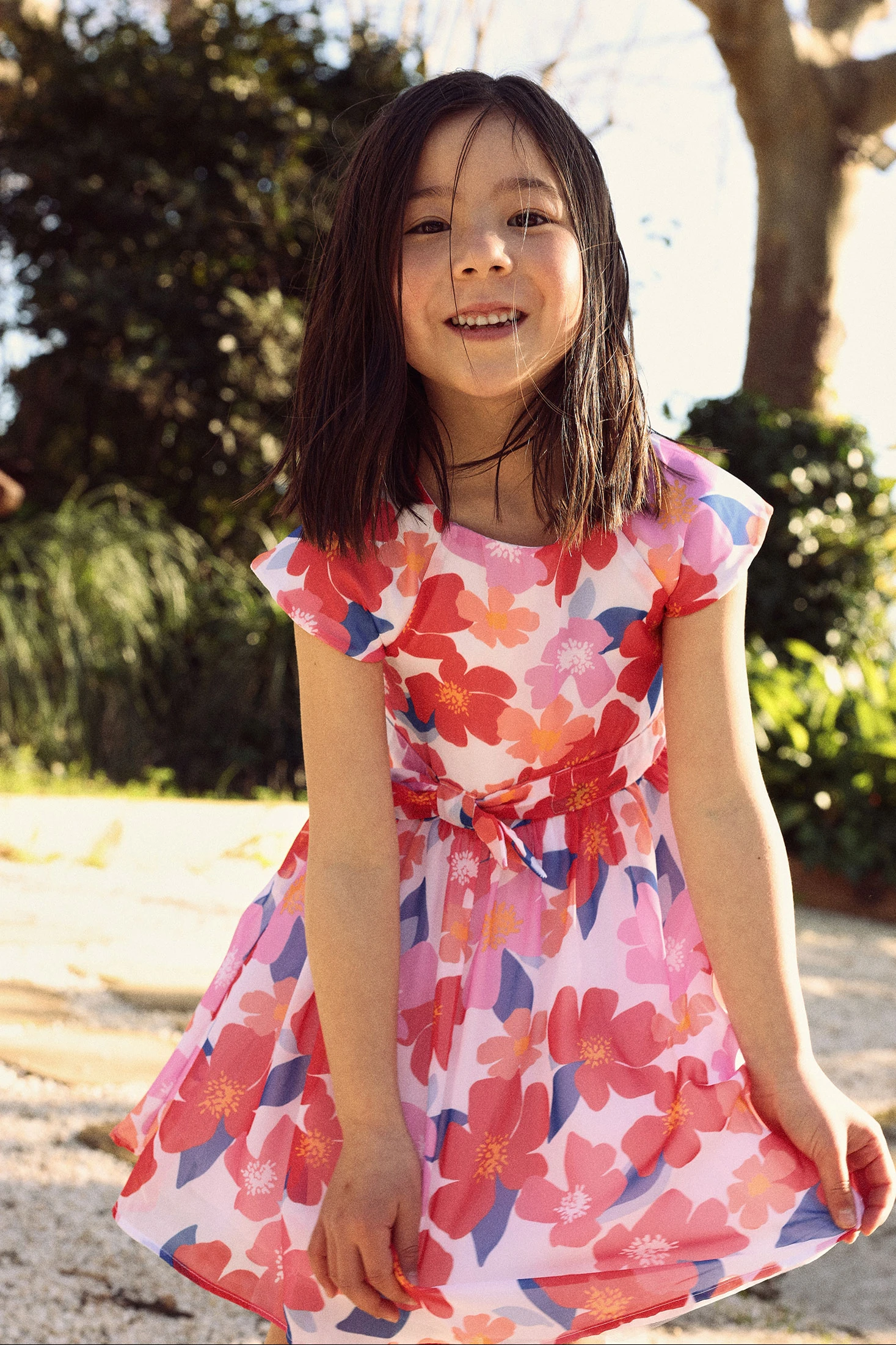 Chiffonkleid ideal für Mädchen, mit einem Blumenmuster in rosa und blauen Tönen, das Frische und Freude ausstrahlt. Der Chiffon verleiht Leichtigkeit und Bewegung, perfekt für warme Jahreszeiten. Das Design verfügt über kurze Ärmel und eine Schleife in der Taille, die der Kleidung einen Hauch von Eleganz verleiht. Erhältlich in Größen von 12 Monaten bis 10 Jahren, ist es eine vielseitige Option für besondere Anlässe. Kann mit einfachem Zubehör kombiniert werden, um einen eleganten und bequemen Look für die Kleinen zu vervollständigen.