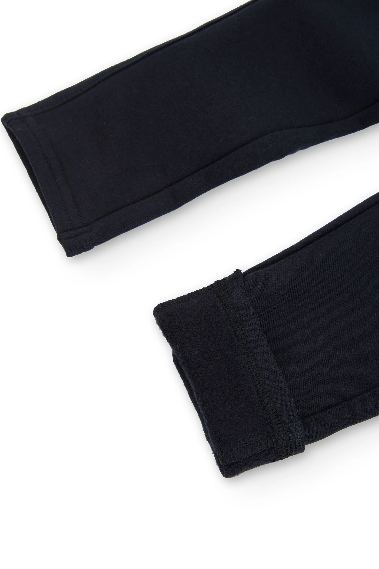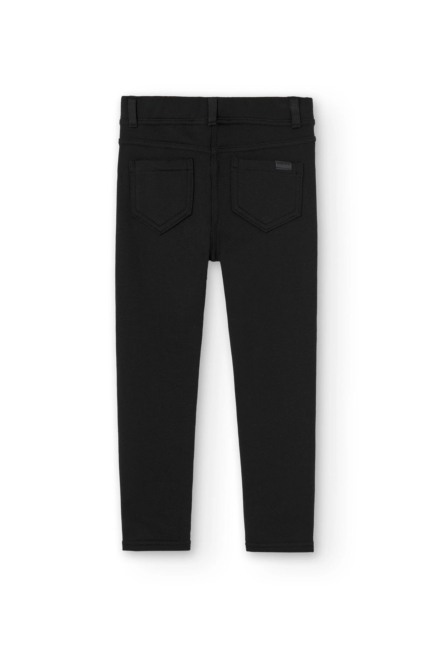 Schwarze Mädchen-Elastik-Fleece-Hose mit Gummibund, Fronttaschen und Hosenschlitz ist mit einem dekorativen Etikett verziert. Die Dekoration ist ein Etikett mit Details der Marke. Erhältlich ab Größe 4 Jahre bis 16 Jahre.